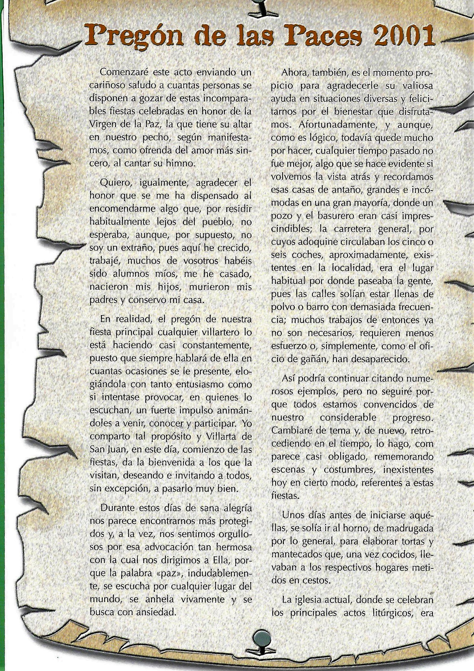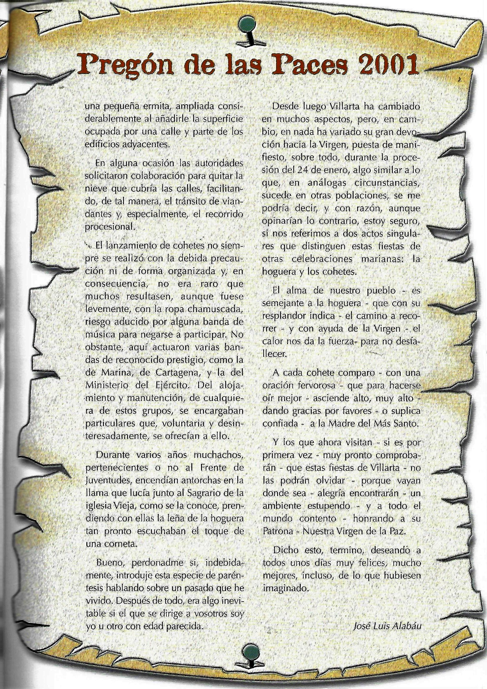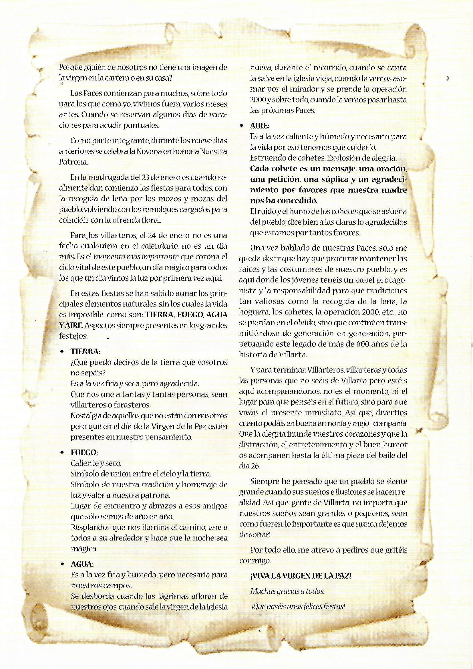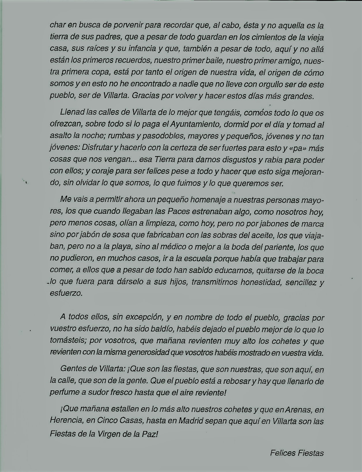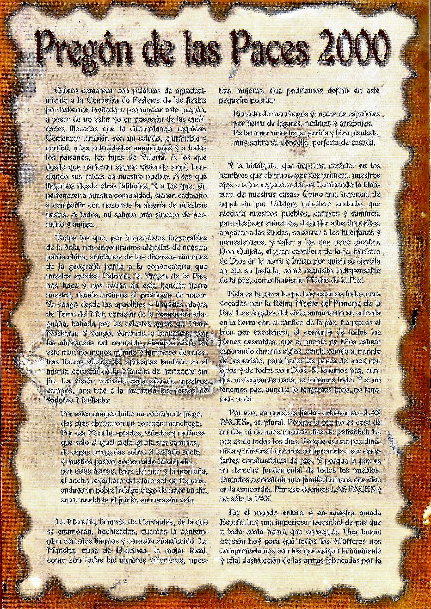 Solo para terminar este larguísimo preámbulo hacer una indicación que se recogía acerca de los pregones de Paces y de sus pregoneros. La nota decía así: «El pregón de fiestas ha tenido como pricipal característica la de ser pronunciado siempre por gente de Villarta, salvo en una ocasión, que invitado un conocido gronista de la provincia, no pudo celebrarlo por cierto malestar producido entre los presentes en el acto, ya que siempre se ha mentenido la costumbre de hablar de las Paces y para ello como aquí se dice vulgarmente, se han tenido que mamar desde pequeños. Es lógico, por tanto, que el aspecto literario de los mismos no sea su principal característica, sino mas bien su emotividad, sencillez y apasionamiento. En otros, -no citados algunos en el programa- podemos citar como pregoneros a: Alfonso Rincón Serrano, José Muñoz Torres ( sustituyendo al inolvidable José Pérez Archidona que no pudo hacer su pregón por enfermedad), José Gerardo Muñoz Isla y María Paz Muñoz Camacho (esta última a cargo de un inolvidable pregón infantil), José Menchero Torres… [JOSE MUÑOZ TORRES. Paces en el recuerdo, 50 años de programas de festejos] y todos los que a partir de la década de los 90 fueron aparenciendo, publicandose su pregón en el programa del año siguiente.