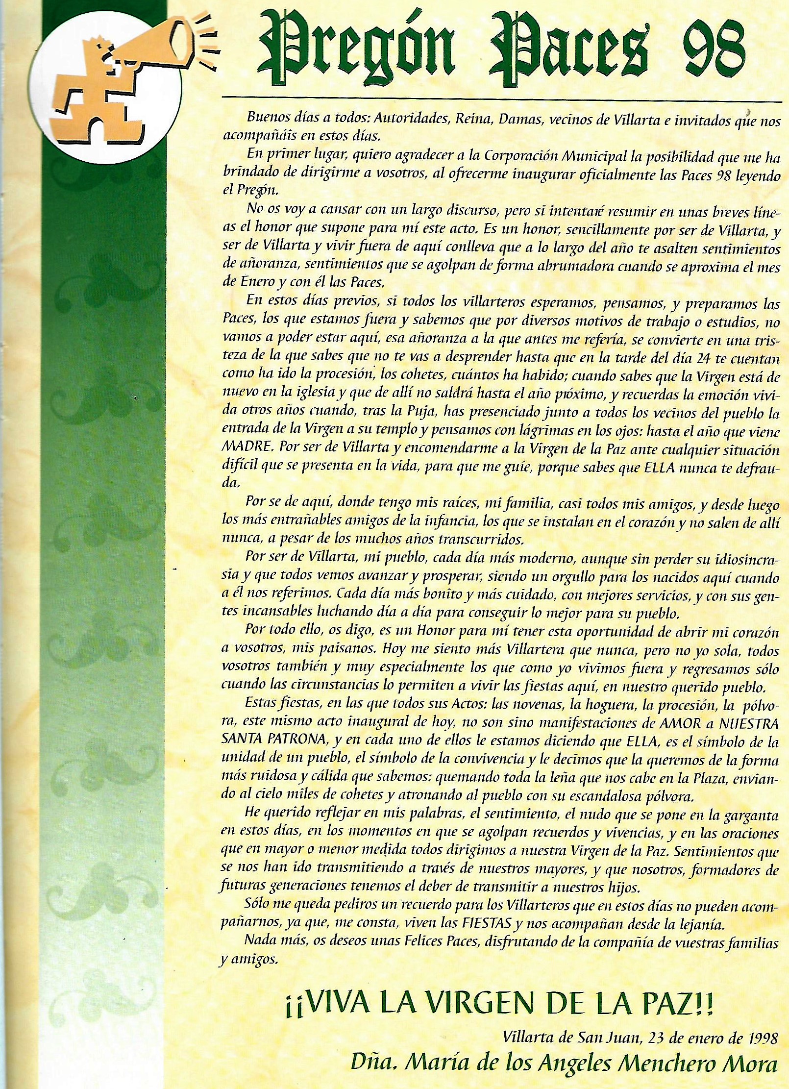 PREGÓN DE «PACES» DEL AÑO 1998, PRONUNCIADO POR Dª MARÍA DE LOS ANGELES MENCHERO MORA