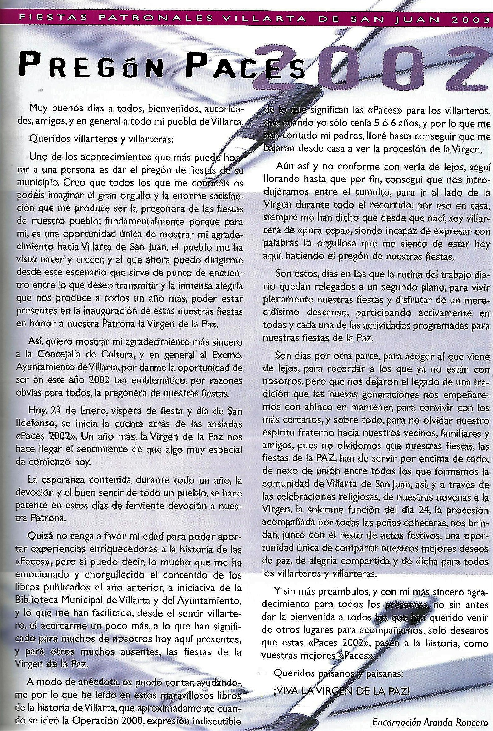 PREGÓN DE «PACES» DEL AÑO 2002, PRONUNCIADO POR Dª ENCARNACIÓN ARANDA RONCERO