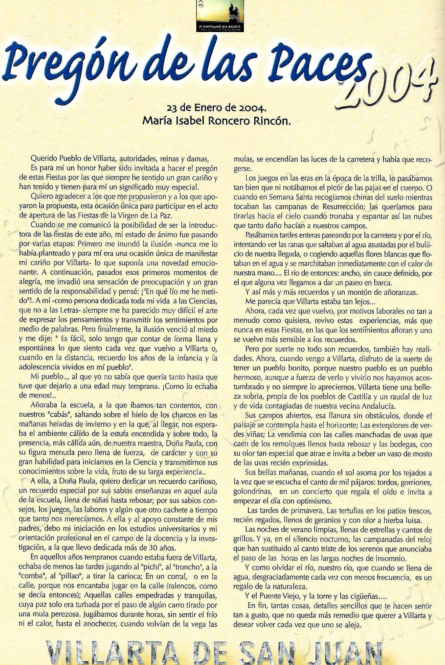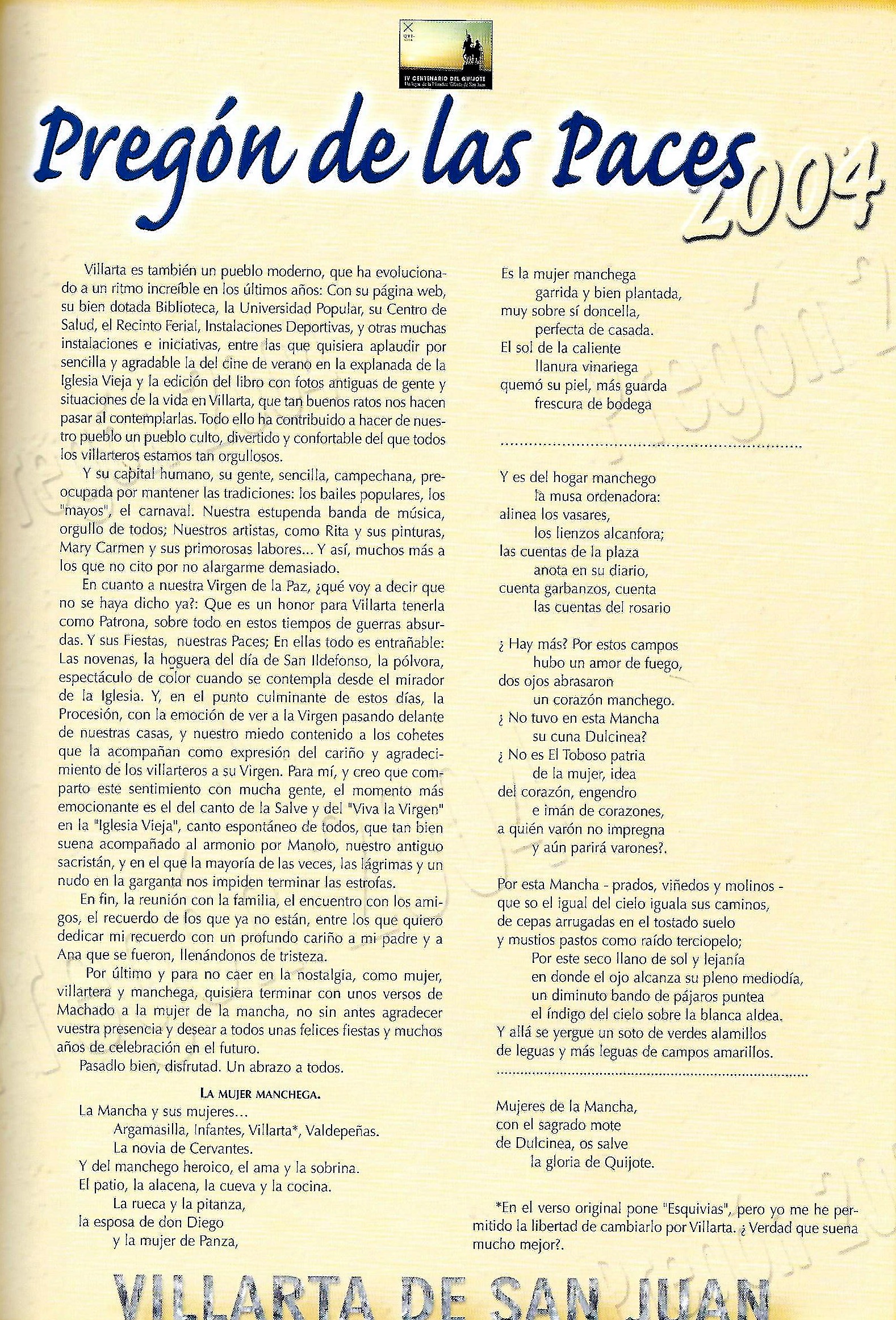 PREGÓN DE LAS «PACES» DEL AÑO 2004, PRONUNCIADO POR Dª MARÍA ISABEL RONCERO RINCÓN