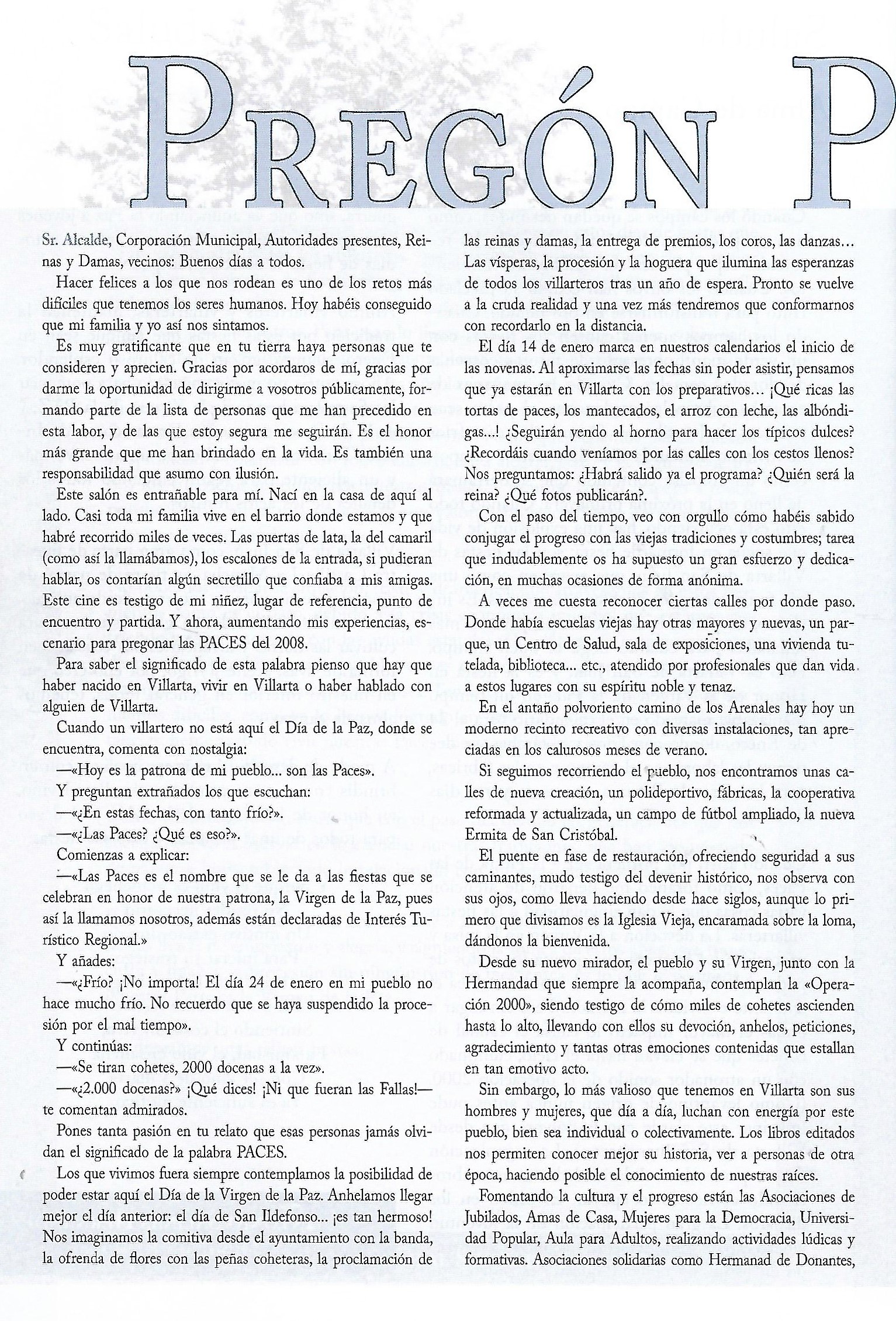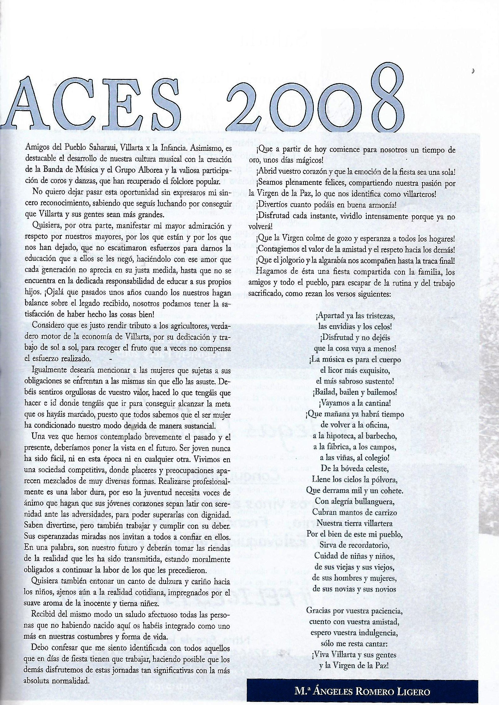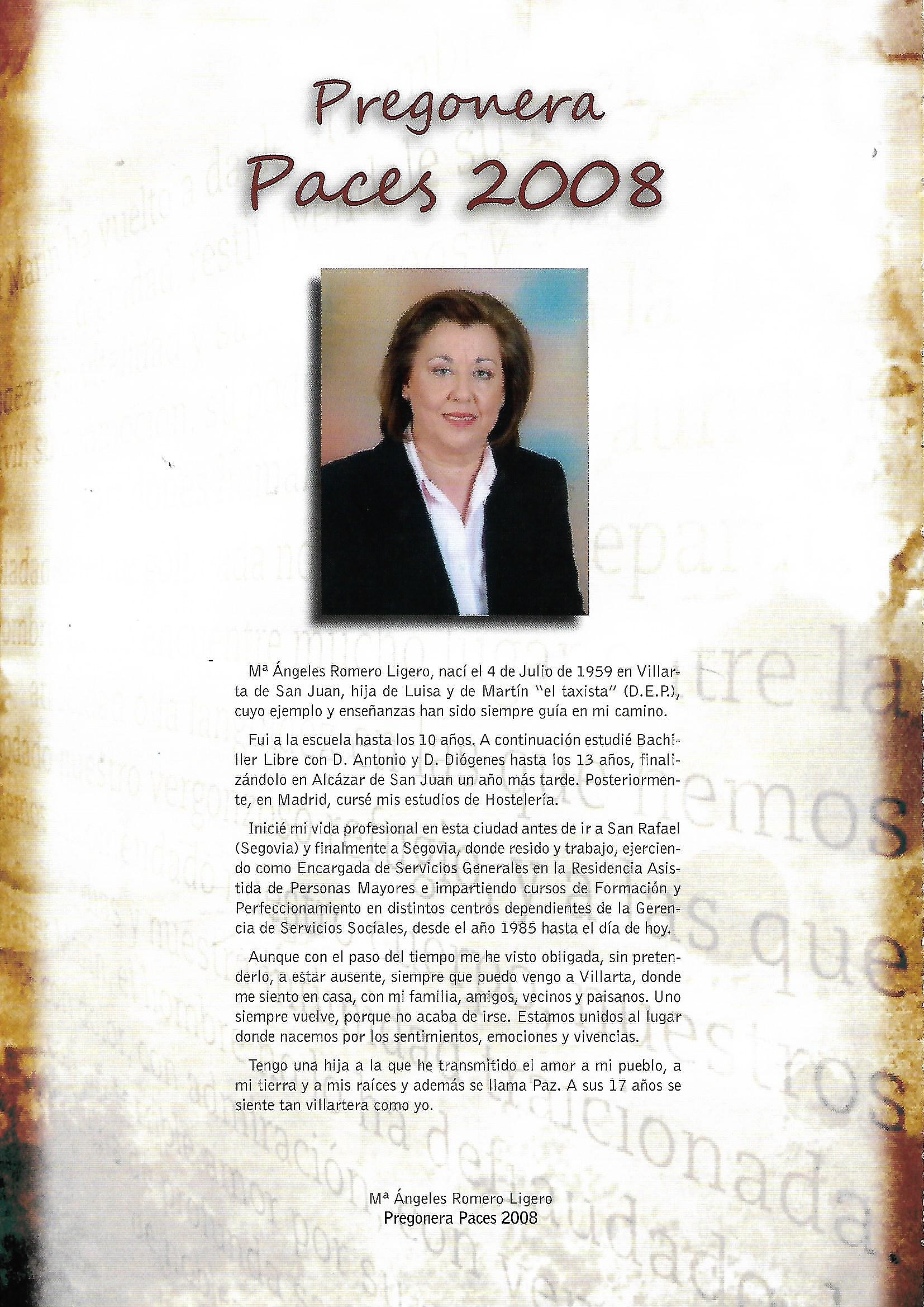 PREGON DE «PACES» DEL AÑO 2008, PRONUNCIADO POR Mª ÁNGELES ROMERO LIGERO
