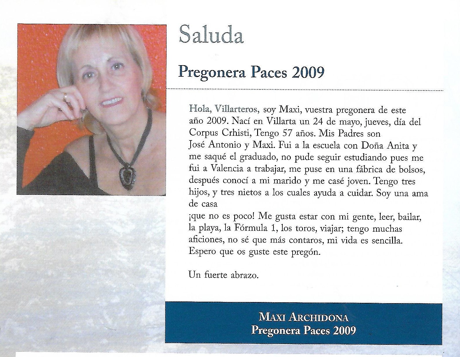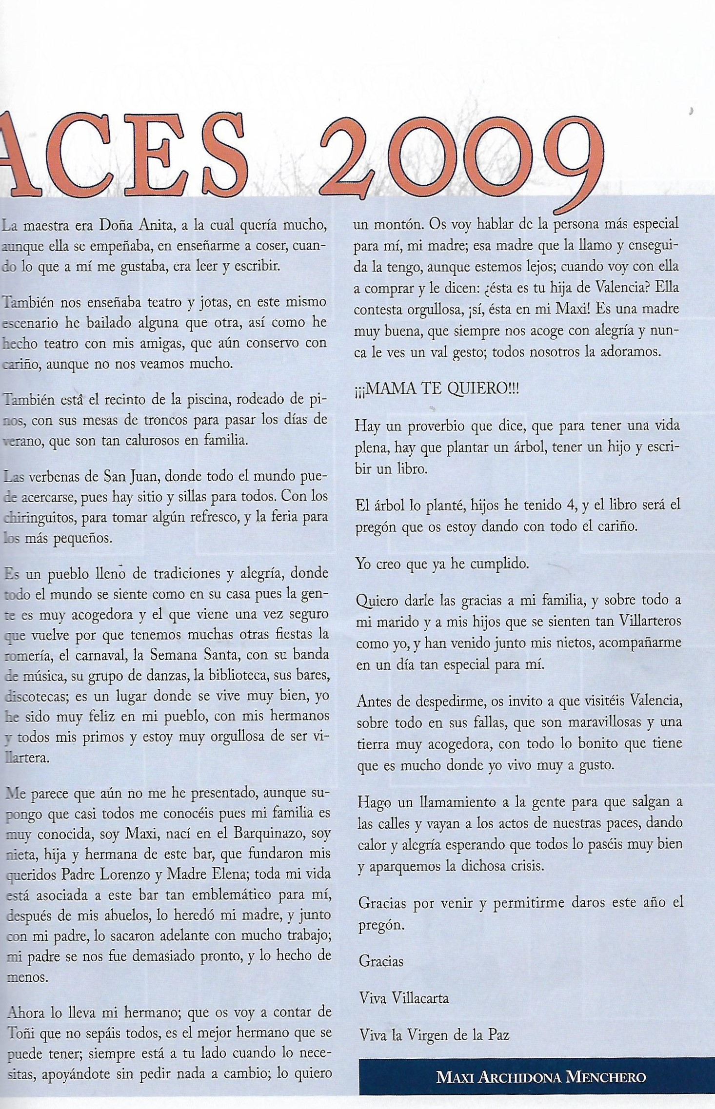 PREGÓN DE «PACES» DEL AÑO 2009, PRONUNCIADO POR Dª MAXIMILIANA (MAXI) ARCHIDONA MENCHERO