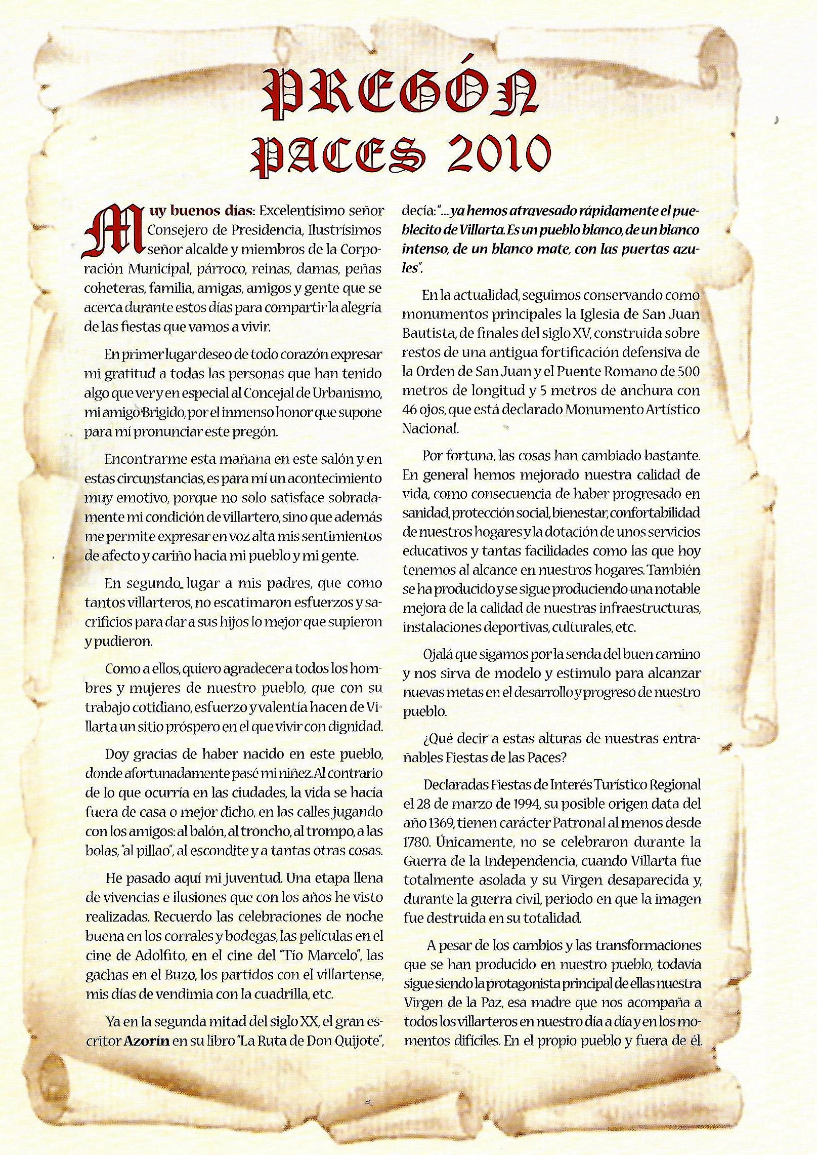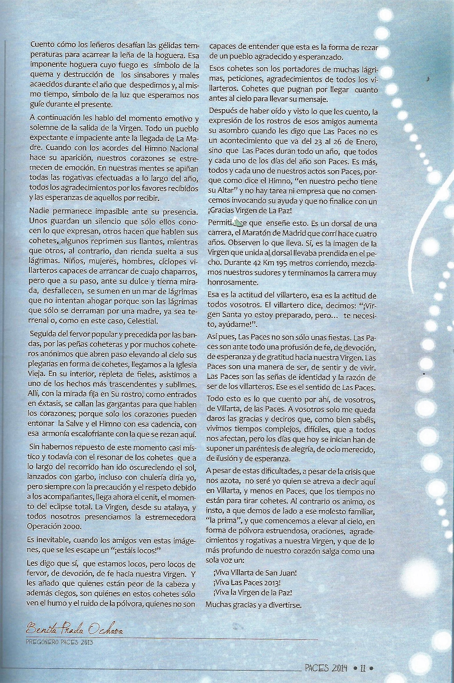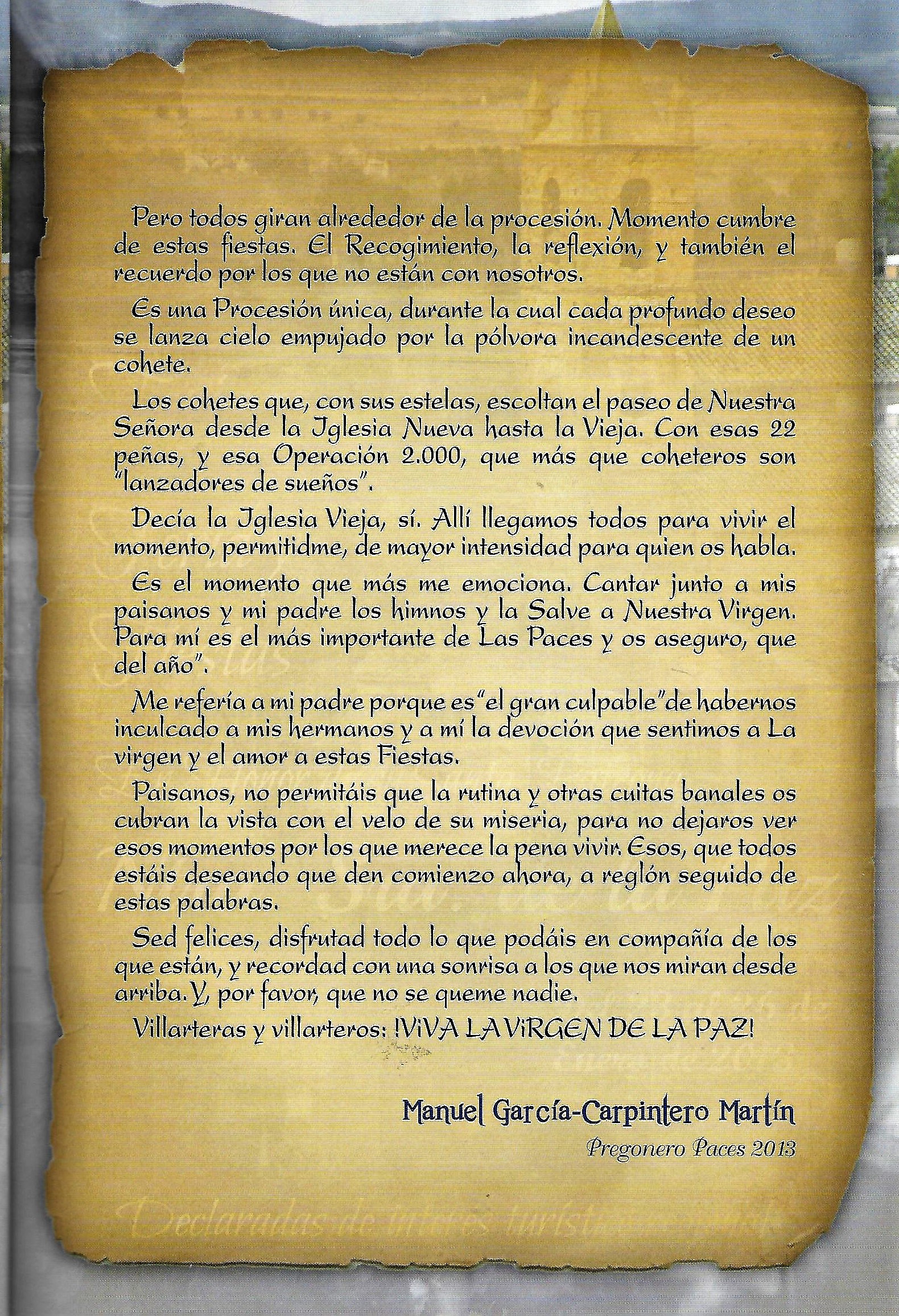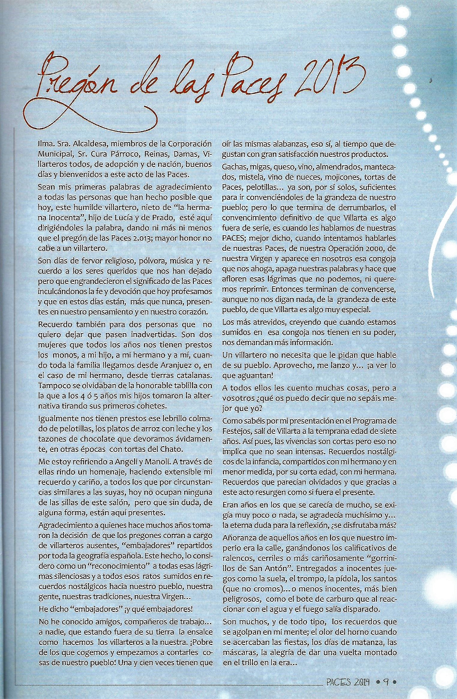 PREGON DE «PACES» DEL AÑO 2013, PRONUNCIADO POR DON BENITO PRADO OCHOVO.