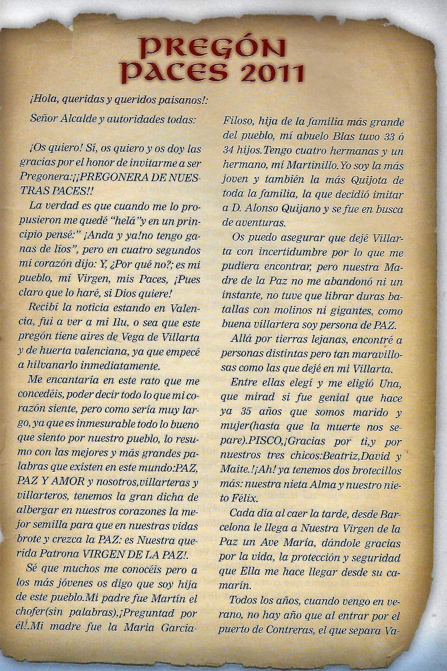 PREGON DE «PACES» DEL AÑO 2011, PRONUNCIADO POR DON ABEL CHOCANO NEGRILLO