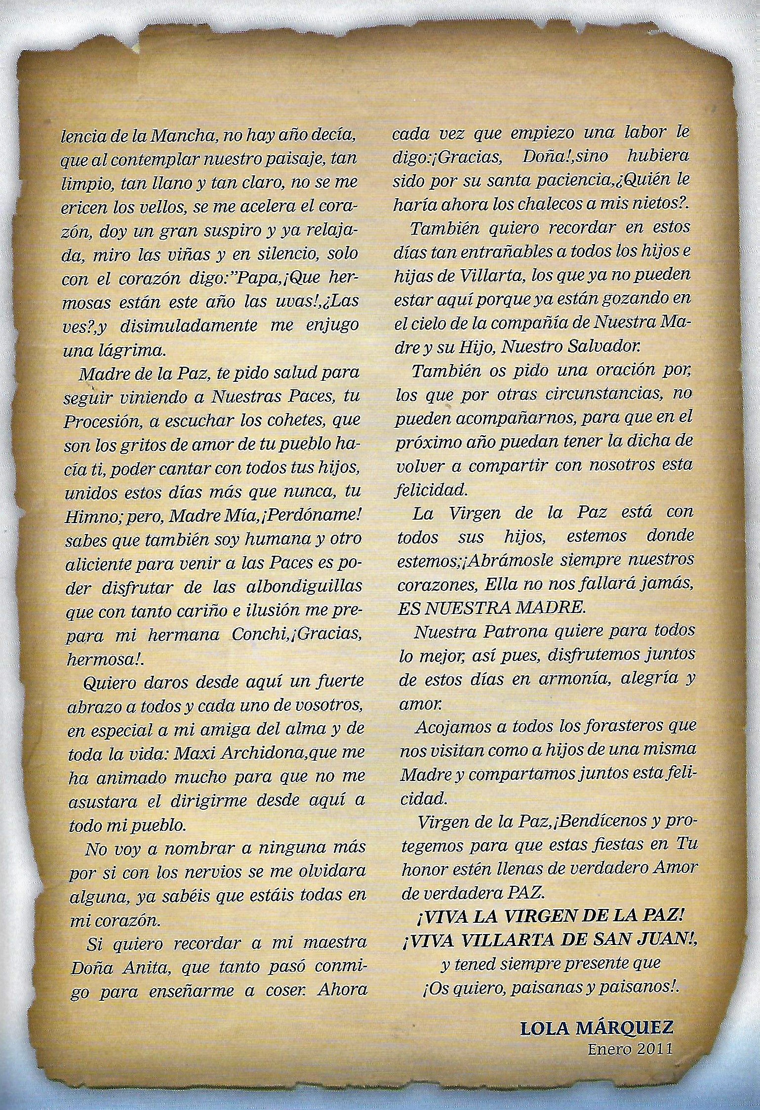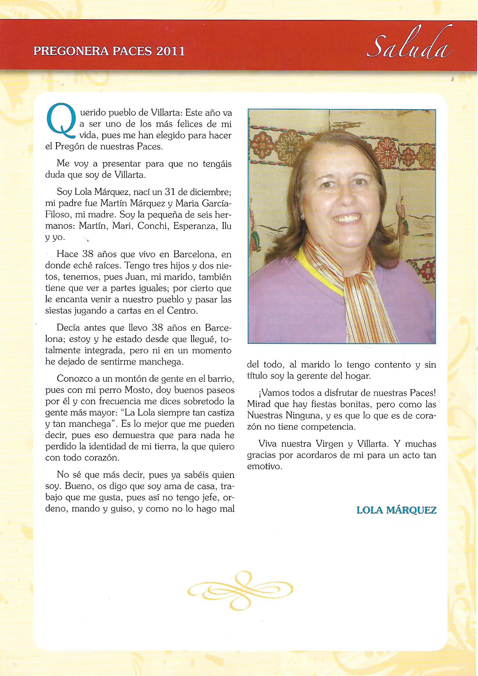 PREGÓN DE «PACES» DEL AÑO 2011, PRONUNCIADO POR Dª MARÍA DOLORES (LOLA) MÁRQUEZ GARCÍA-FILOSO