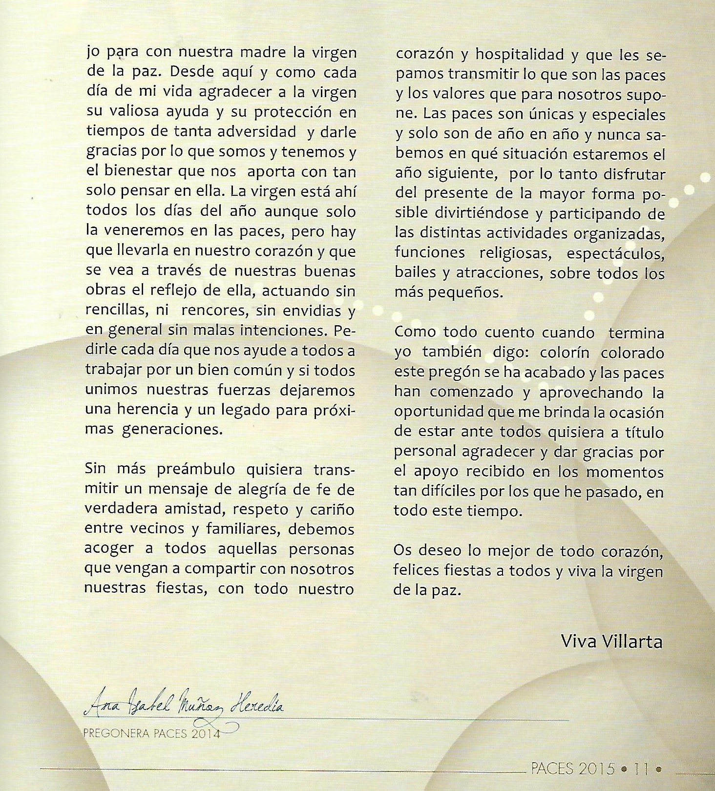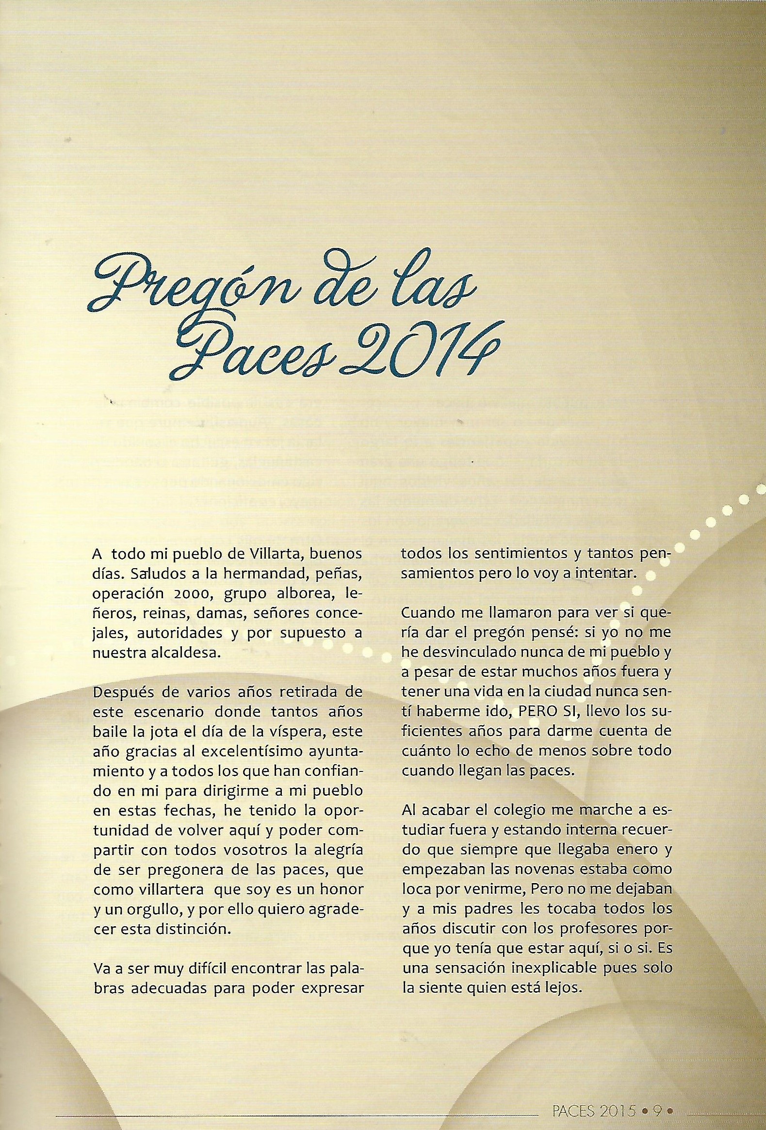 PREGÓN DE «PACES» DEL AÑO 2014, PRONUNCIADO POR Dª ANA ISABEL MUÑOZ HEREDIA