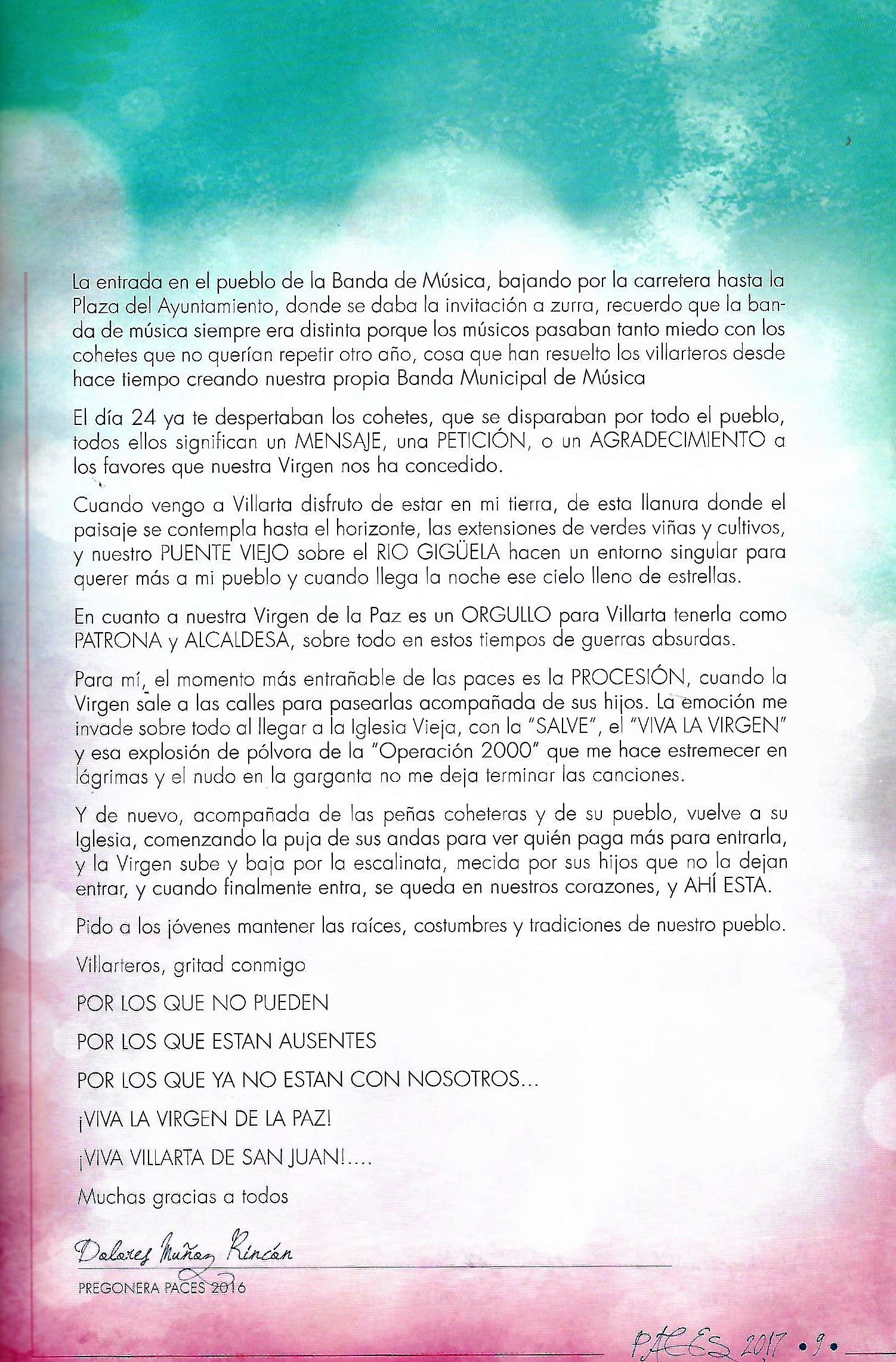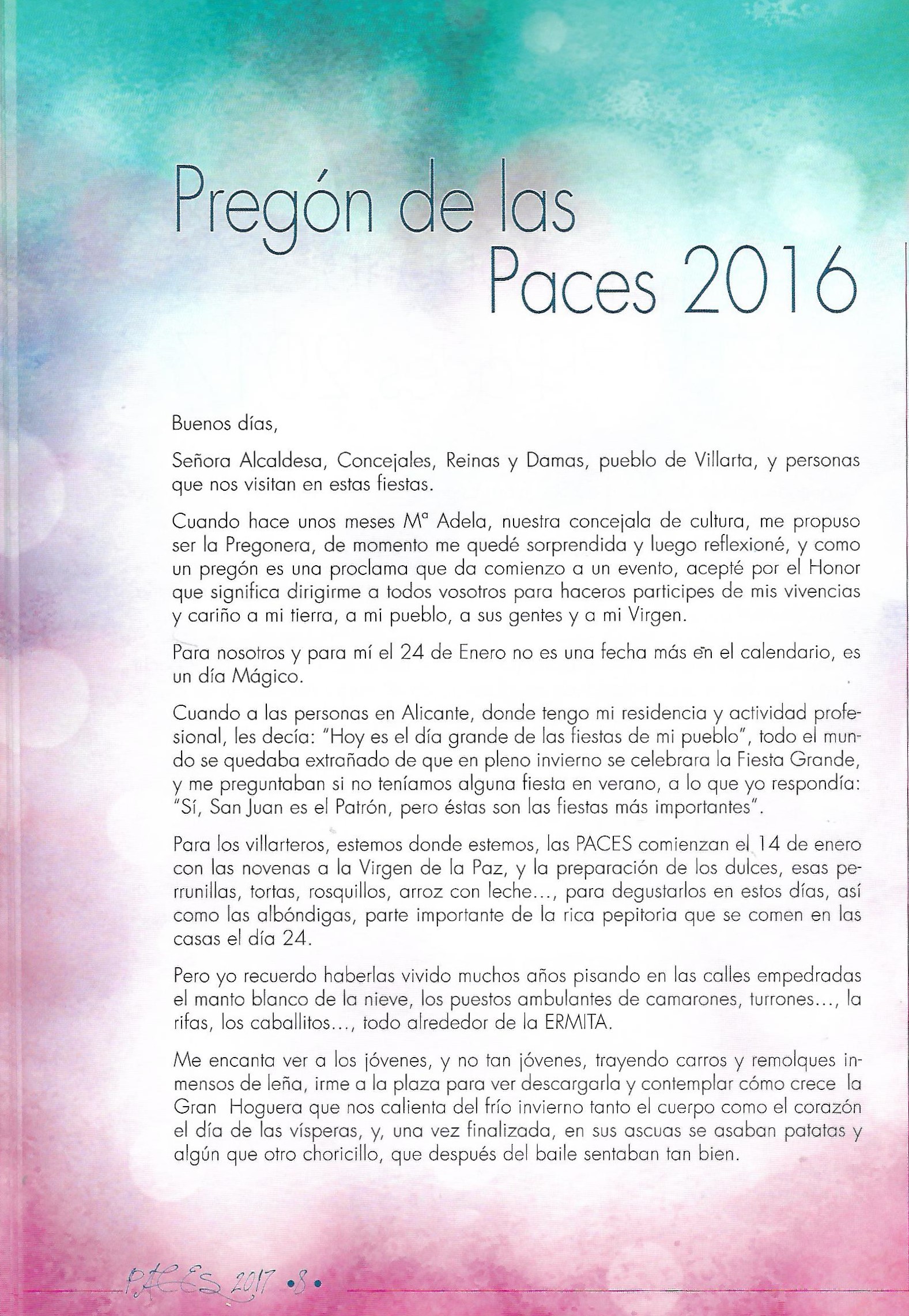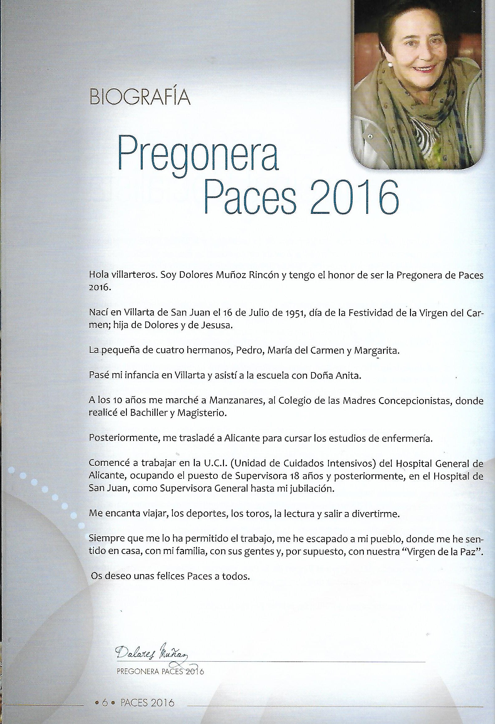 PREGÓN DE «PACES» DEL AÑO 2016, PRONUNCIADO POR Dª DOLORES MUÑOZ RINCÓN
