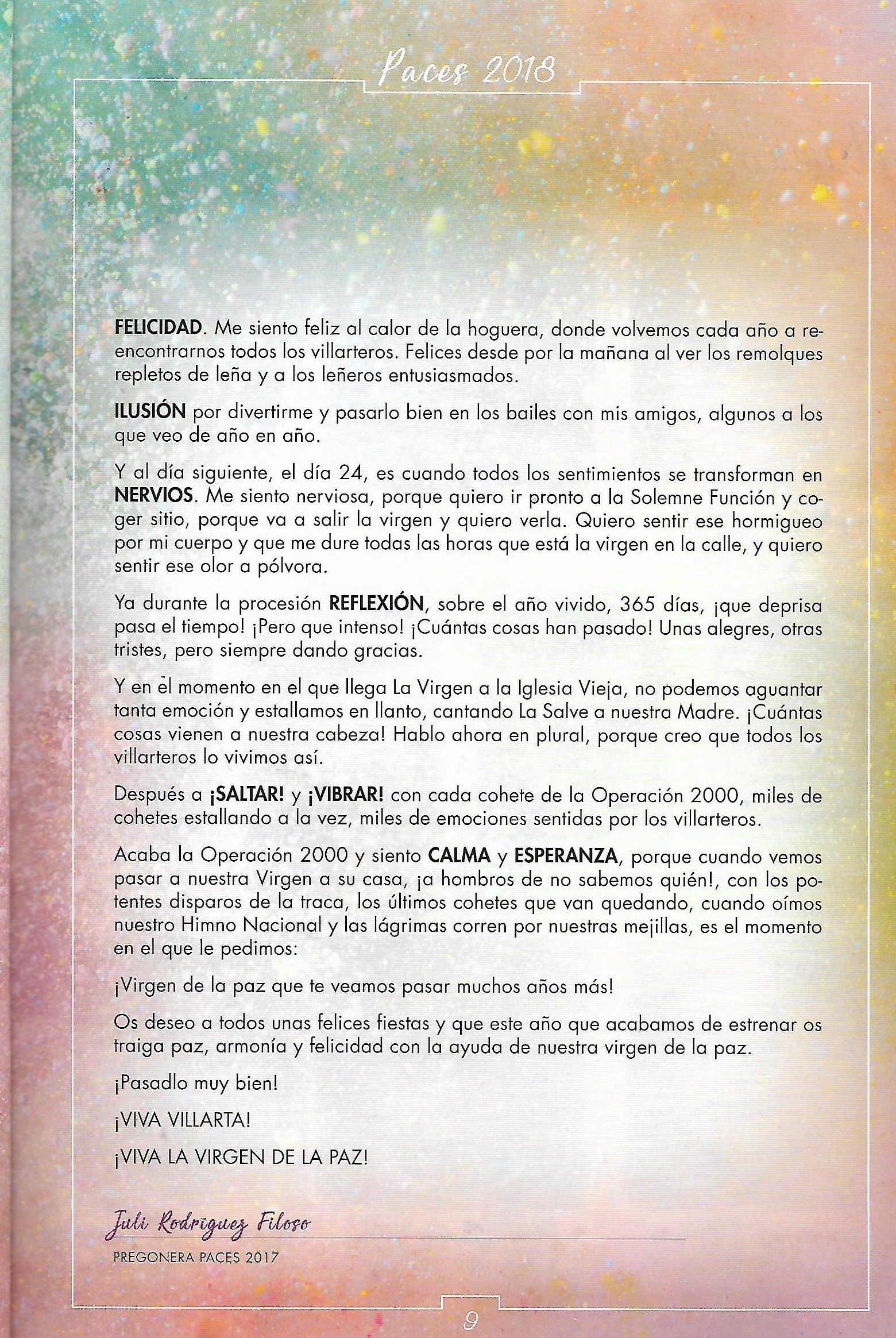 PREGÓN DE LAS «PACES» DEL AÑO 2017, PRONUNCIADO POR Dª JULI RODRÍGUEZ FILOSO