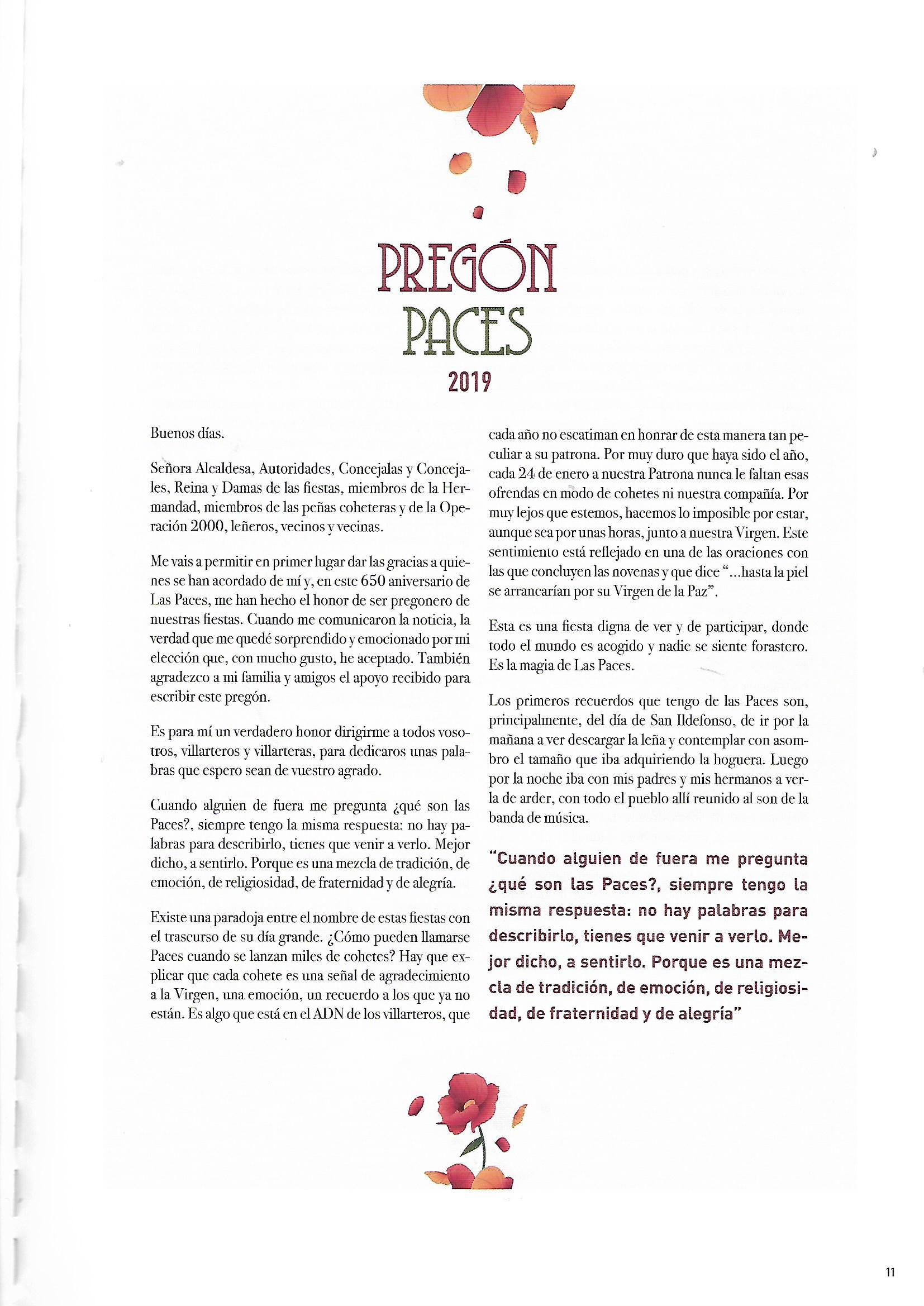 PROGRAMA DE «PACES» DEL AÑO 2019, PRONUNCIADO POR DON LUIS MENCHERO SERRANO