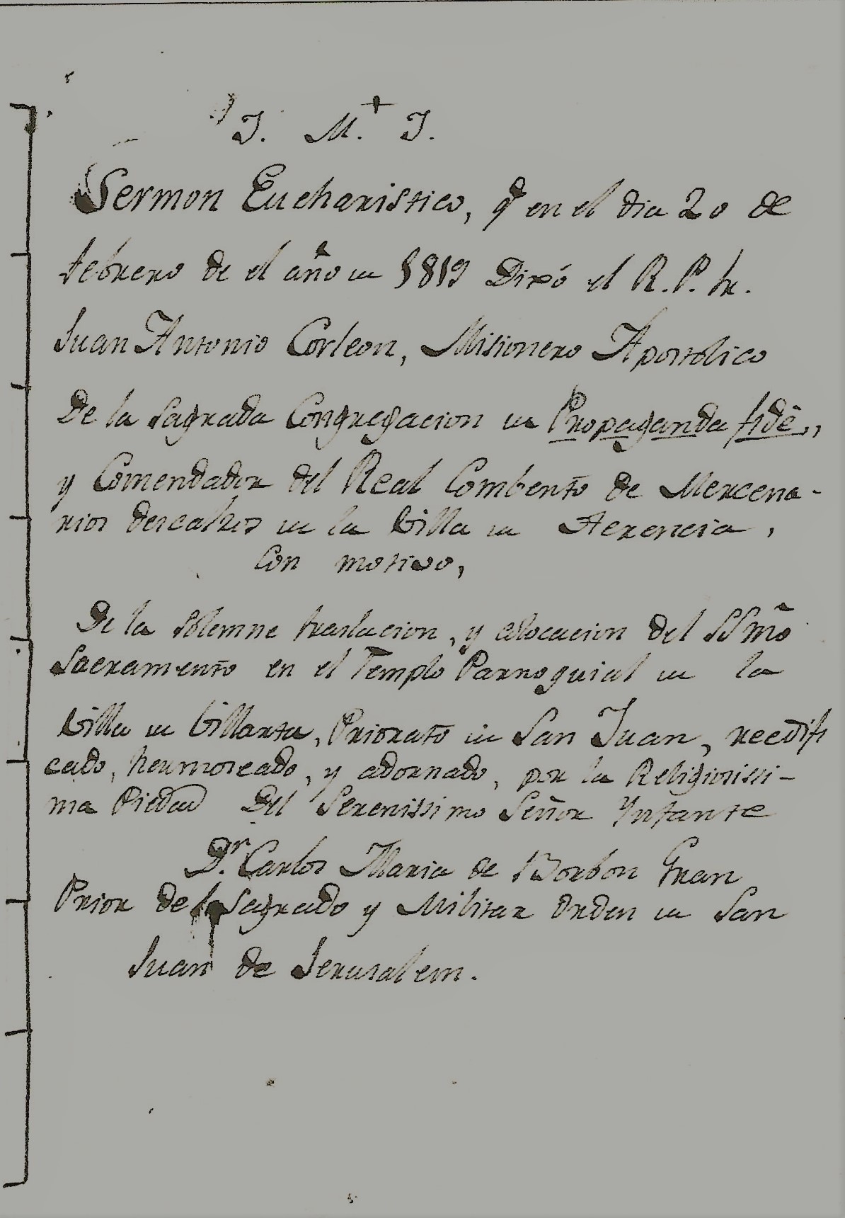 SERMÓN EUCHARISTICO, que en el día 20 de febrero de el año 1819 Dixo el R.P. Fr. Juan Antonio Corleon, misionero Apostolico de la Sagrada Congregación Propaganda fide, y Comendador del Real Combento de Mercenarios descalzos en la villa de Herencia con motivo de la solemne traslación y colocación del SSmo. Sacramento en el Templo Parroquial de la villa de Villarta, Priorato de San Juan, reedificado, hermoseado y adornado, por la religiosísima Piedad del Serenisimo Señor Infante Dn Carlos Maria de Borbon Gran Prior de la Sagrada y Militar Orden de San Juan de Jerusalen.