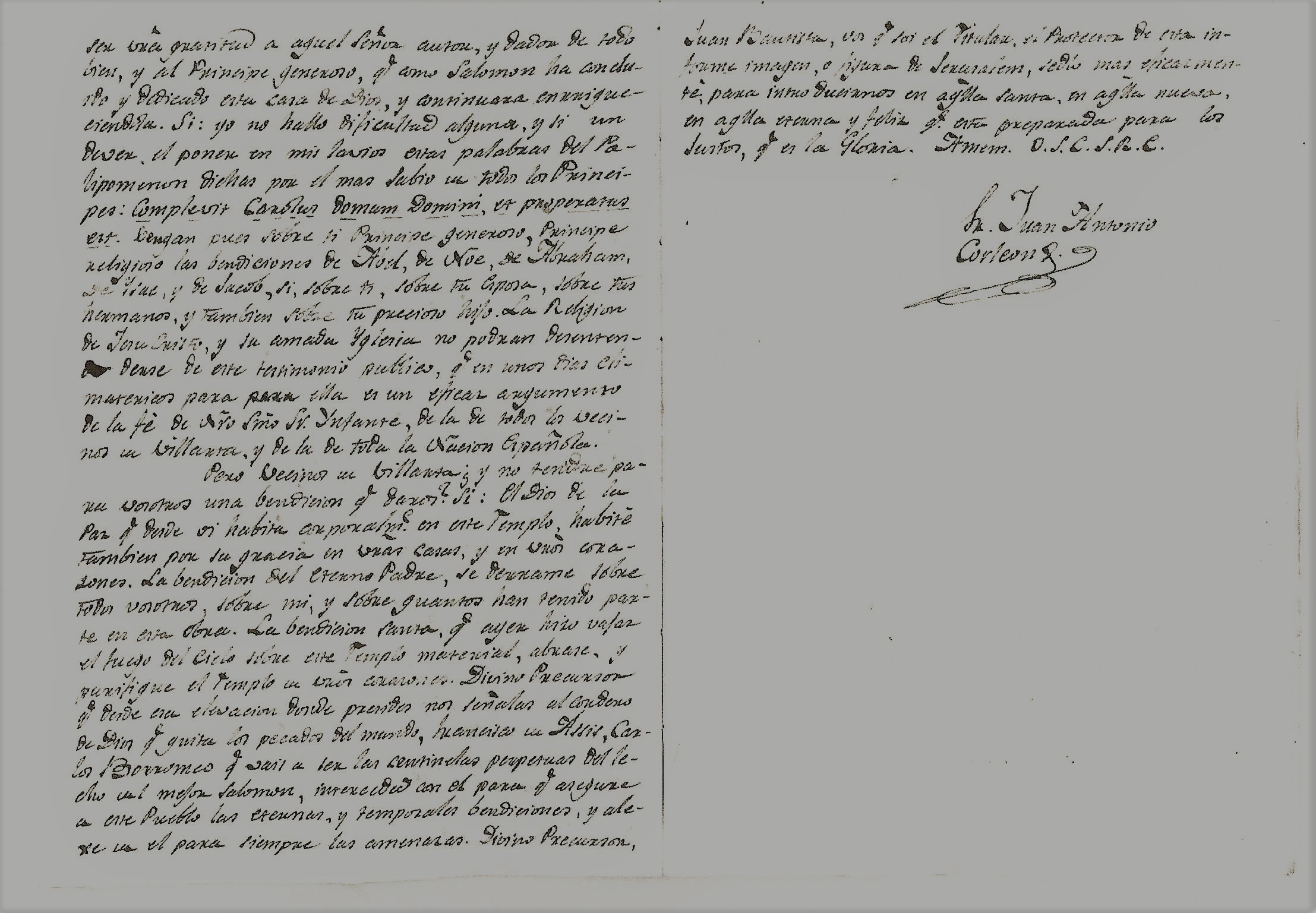 Pero vecinos de Villarta ¿y no tendre para vosotros una bendición que daros? Si: El Dios de la Paz que desde oi habita corporalmente en este templo habitetambién por su gracia en vuestras casas, y en vuestros corazones. La bendición del eterno Padre se derrame sobre todos vosotros, sobre mi, y sobre quantos han tenido parte en esta obra. La bendición santa que ayer hizo vajarel fuego del cielo sobre este templo material, abrase y purifique el templo de vuestros corazones. Divino Precursor que desde esa elevación donde presides nos señalas al cordero de Dios que quita los pecados del mundo, francisco de Asis, Carlos Borromeo que vais a ser los centinelas perpetuos del lecho del mejor Salomon, interced con el para que asegure a este pueblo las eternas y temporales bendiciones, y alexe de el para siempre las amenazas. Divino Precursos,[19] Juan Bautista, vos que soi titular, el Protector de esta informe imagen o figura de Jerusalen, sedlo mas eficazmente para introducirnos en aquella santa, en aquella nueva, en aquella eterna y feliz que esta preparada para los justos , que es la Gloria. Amem. O.S.C.S.R.C. Fray Juan Antonio Corleon.
