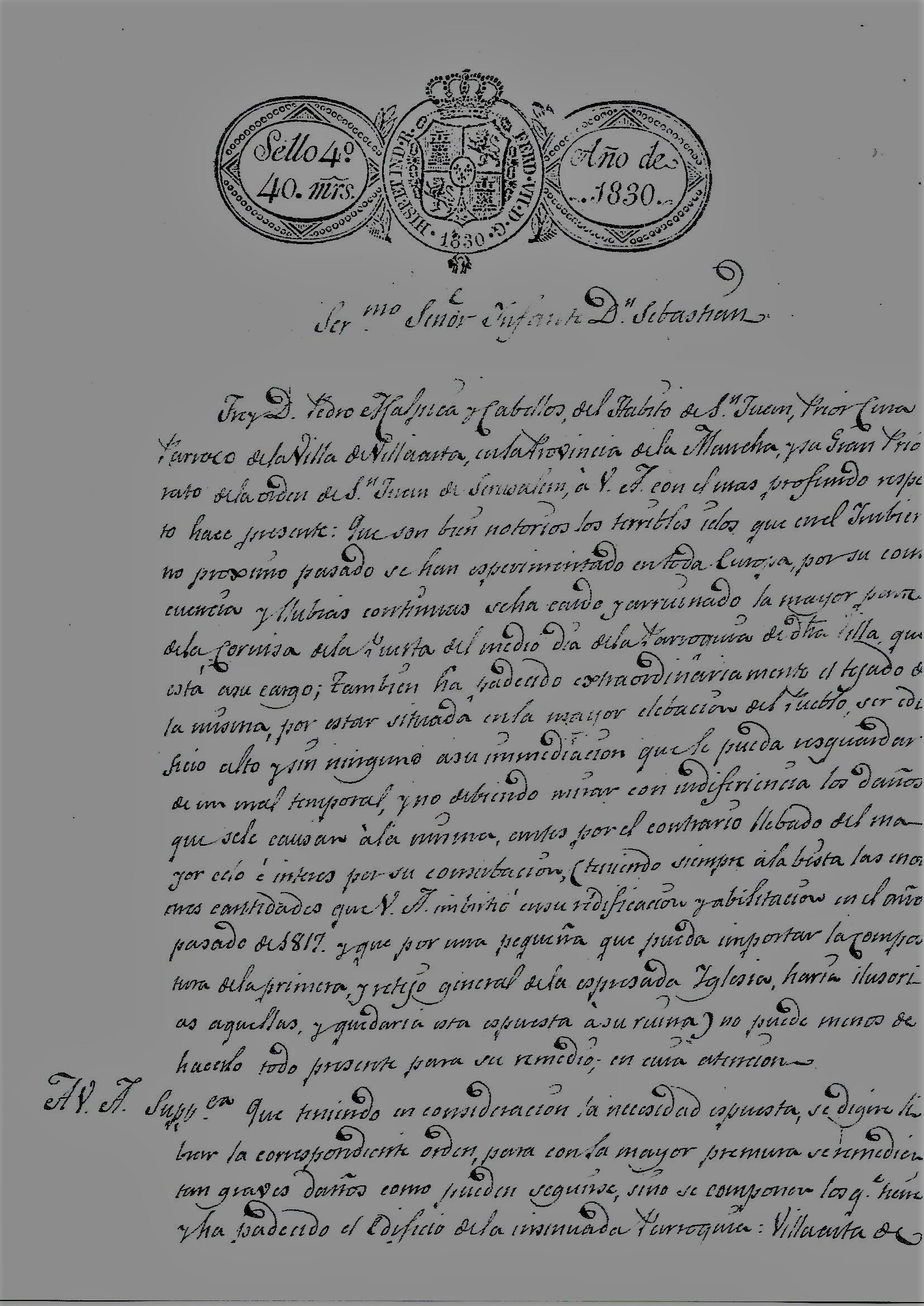 Frey D. Pedro Malpica y Cabellos del Habito de San Juan, Prior Cura Párroco de la Villa de Villaarta, en la Provincia de la Mancha, y su Gran Priorato de la Orden de San Juan de Jerusalen, a V.A. con el mas profundo respeto hace presente: Que son bien notorios los terribles ielos (hielos) que en el Ymbierno (Invierno) proximo pasado se han esperimentado en toda Europa, por su consecuencia y llubias continuas se ha caido y arruinado la mayor parte de la cornisa de la Puerta del medio día de la Parroquia de dha (dicha) Villa que está a su cargo; Tambien ha padecido extraordinariamente el tejado de la misma por estar situada en la mayor elebacion (elevación) del Pueblo, ser edificio alto y sin ninguno a su inmediacion que le pueda resguardar de un mal temporal, y no debiendo mirar con indiferencia los daños que se le causan a la misma, antes por el contrario llebado (llevado) del mayor celo e interés por su conserbación (conservación) ( teniendo siempre a la bista (vista) las enormes cantidades que V.A. imbirtio (invirtió) en su redificacion y abilitación (habilitación) en el año pasado de 1817 y que por una pequeña que pueda importar la compostura de la primera y …. (retijo?) general de la expresada Iglesia, haria ilusorias aquellas y quedaria esta expuesta a su ruina) no puede menos de hacerlo todo presente para su remedio en cuia (cuya) atención: A V.A. suplica: Que teniendo en consideracion la necesidad expuesta, se digne librar la correspondiente orden, para con la mayor premura se remedie tan graves daños como pueden seguirse. sino se componen los que tiene y ha padecido el edificio de la insinuada Parroquia: Villaarta de San Juan, 26 de junio de 1830= Serenísimo Señor . A.L.R.P. de V.A. Suppca. Fr. D. Pedro Malpica y Cabellos. (AGP. INVENTARIO DE DON GABRIEL DE BORBÓN. SECRETARIA. Villarta. Legajo 294. Iglesia Parroquial)