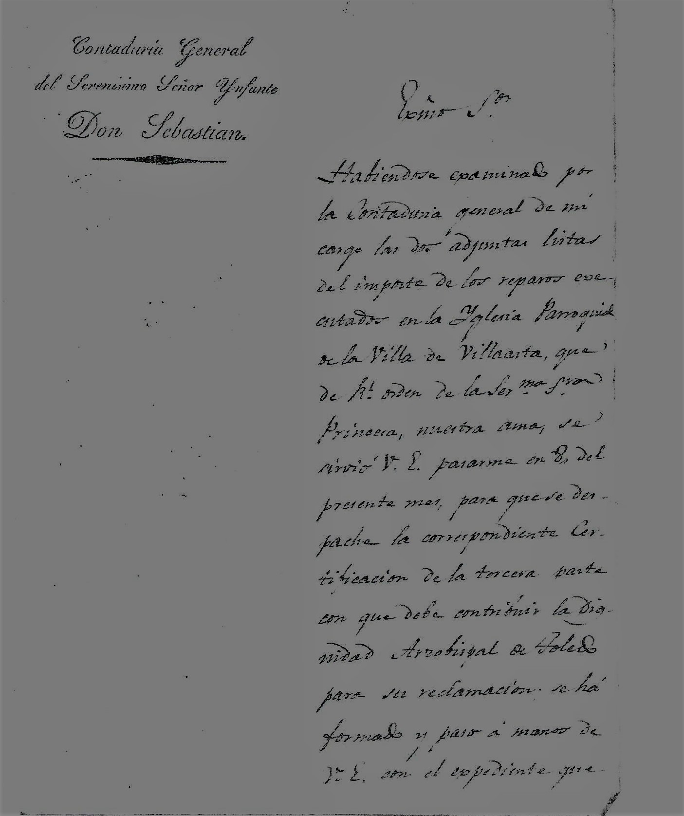 » Exmº Señor. Habiendose examinado por la Contaduria General de mi cargo las dos adjuntas listas del importe de los reparos ejecutados en la Iglesia Parroquial de la Villa de Villarta, que de Real orden de la Serenísima Sra. Princesa, nuestra ama, se sirvió V.E. pasarme en 8 del presente mes, para que se despache la correspondiente certificación de la tercera parte con que debe contribuir la Dignidad Arzobispal de Toledo para su reclamación se ha formado y paso a manos de V.E. con el expediente que la acompaña la referida Certificación del importe de dicha tercera parte, que asciende a trescientos treinta y cuatro reales de vellón. Dios guarde a V.E. muchos años. Madrid 18 de Nobiembre de 1830 .Excmº Señor/ = José Luis Tordera. Al Exmº Señor Conde de Villahermosa» .