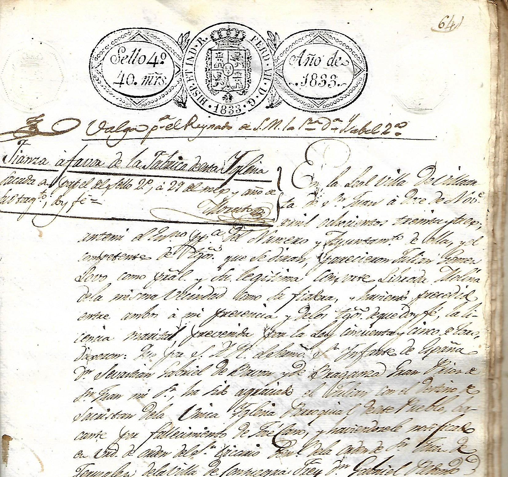 Por cuanto corresponde a la citada dignidad de Gran Prior la provisión, presentación y nombramiento de los empleos y Beneficios Eclesiásticos en el Gran Priorato Frey Don Joaquin hallándose en el dia vacante la sacristía de la Iglesia Parroquial de la villa de Villarta una del indicado Gran Priorato por fallecimiento de José Cano, he venido por decreto a primero del corriente en conferirla a vos Julian Gómez Lobo vecino de dicha villa en atención a los buenos informes que se me han dado, a concurrir en vos las circunstancias y requisitos necesarios y los méritos que teneis contraídos en el expresado destino que estais desempeñando interinamente. Por tanto os elegimos, nombramos y diputamos (Asignar a una persona o cosa para desempeñar una función determinada.) a vos el dicho Julian Gomez Lobo por tal sacristan a la enunciada iglesia Parroquial de la Villa de Villarta para que por el tiempo de mi voluntad, useis y ejerzáis este empleo haciendo todas las cosas a él tocantes y pertenecientes según lo han hecho y debido practicar los demás sacristanes vuestros antecesores, percibiendo el salario, derechos y emolumentos que estos hayan disfrutando debido gozar y mando seais habido y tenido por tal sacristan de la referida Iglesia Parroquial de la villa de Villarta, que se os guarden y hagan guardar las honras, franquezas y prerrogativas que por la misma razón os correspondan y que se os acuda y haga acudir con dichos derechos, salarios, gajes y emolumentos como se ha practicado con vuestros antecesores sin que os falte cosa alguna entendiéndose todo con la precisa calidad a que antes es esperarla a servir habéis de dar fianza a satisfacción del Vicario Gral. Eclesiastico del mismo Gran Priorato para la seguridad de las alhajas que entrarán en vustro poder propias de la Iglesia. Que asi es mi voluntad. Dado en Palacio a 20 de julio de 1833= Sebn= José Luis Tordera =