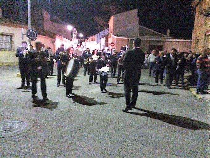 Viernes Santo. Y llegaba el día que el pueblo quedaba en silencio, inmóvil, pensativo y dolorido. En ese día a los chicos se nos había prohibido, correr, saltar, jugar, pero «¡Qué hacéis niños! ¡Estaos quietos que se ha muerto el Señor!». Eran otros tiempos pero incluso las mujeres tenían como cosa mal vista arreglarse y no digamos pintarse, como mucho un velo negro tapando su cabeza, porque ese día estaba muriendo un Hombre: Jesús. Poco a poco, con los años las cosas fueron cambiando y si me apurais solo quedó la tradición generalizada: la del potaje de Semana Santa, a nivel global. ¡Hay que seguir la tradición!. La tarde, en la iglesia, en los oficios de tinieblas, donde se iba a recordar la muerte injusta de un hombre justo, se dejaban ver y siguen dejandose ver muchos huecos [Ahora es mas normal porque la Iglesia es mucho mas grande]. Ahora ese día ya no es como era antes, ni mucho menos: se sale, se pasea, alguna cañeja en los bares esperando la procesión del silencio… Ya desde hace años (unos treinta años) la banda de música se preparaba para acompañar el cortejo de imágenes dolientes; Al principio era la banda de tambores y cornetas comandada por Chencho; hasta hace poco, la banda de tambores y cornetas, dirigida por Paco Loro, se turnaba con la banda de música en el recorrido. Y de pronto, -recordando a la Maria, la saetera de Villarta-, una voz se levantaba trémula desde algún balcón o alguna ventana,…. No hemos sido pueblo de saetas pero será muy difícil olvidar la queda voz de aquella mujer, cantando a Jesús ya en la cruz, y ella a sus pies agarrada a la carroza, desgranando su oración… Antes de la procesión se decía el sermón de las siete palabras pero poco a poco se fueron perdiendo en el silencio….