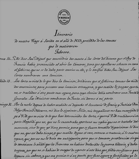 » el sábado 15 de febrero de 1823 las Cortes en vista de lo que dixo la comisión, decidieron que el Gobierno tomase las medidas convenientes para precaver una invasión extranjera y que cuando lo juzgase oportuno, se trasladase a otro punto más seguro, para cuya elección debía nombrarse una junta de Generales. [El texto está dictado por el Rey] Los MInistros nombraron la Junta sin darme a mi parte. (Domingo 16 de febrero de 1923) Por la noche después de haber acabado su despacho el Secretario de Gracia y Justicia Don Felipe Benicio Navarro, me dixo lo siguiente: Señor mis compañeros [ se refiere al resto de Secretarios, equivalentes al actual de ministros) me han encargado diga a V.M. que en vista d elo que han determinado las Cortes, si querrá V.M. trasladarse a otra parte. Respondí que no. que no lo encontraba oportuno; me replicó que no se trataba del momento, sino de que yo diera mi permiso para que se fuesen tomando disposiciones; le dixe que no, que eso daba tiempo, y que cuando llegase el caso, entonces se trataría (…) yo le repliqué que no se ganaba nada en salir de Madrid, y solo se dilataba algún tiempo, pues si llegaban a entrar los franceses, y no nos encontraban en Madrid, seguirían hasta donde estuviesemos, que además el pueblo de Madrid sentiría mucho mi ida y creería que yo le abandonaba; a esto respondió: que si lo sentiría, pero que los buenos lo llevarían con gusto porque s eharían cargo de las circunstancias: en fin le dixe , que respondiera a sus compañeros que no·. [BIBLIOTECA NACIONAL DE ESPAÑA. Sección Manuscritos. Itinerario de nuestro viaje a sevilla en el año de 1823 : precedido de las causas que lo motivaron. Fernando VII ,