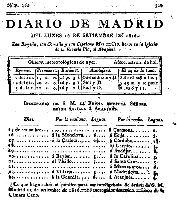 Esta era la situación en España, a grandes rasgos, en el momento que volvemos a encontrar la primera reseña en la prensa referida a Villarta. Se trata de una nota del Diario de Madrid, concretamente en el nº 260 correspondiente al lunes, día 16 de septiembre de 1816 en el que se publicaba el itinerario de S.M. la Reina de España nuestra Señora, desde Sevilla a Aranjuez. La futura reina, María Isabel de Braganza, procedente de Brasil, había contraido matrimonio con el rey Fernando VII, en el navio San Sebastian, por poderes otorgados al duque del Infantado.