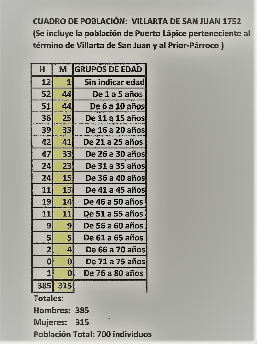 Hecha esta observación vamos a los datos del Catastro del Marqués de la Ensenada. En el mismo se señalan 700 registros correspondientes a la población de Villarta de San Juan (incluida los habitantes de Puerto Lápice pertenecientes al término de VIllarta de San Juan y al cura-Prior de Villarta de San Juan). Por sexo se corresponden a 385 hombres y 315 mujeres y con clasificación especial el número de Párvulos ( menores o iguales a 7 años de edad) que eran 74 niños y 63 niñas. La búsqueda de esta información y la estructuración de la misma ha sido por familias, con todos sus componentes incluidos aquellos trabajadores de ella que convivían en la misma casa del dueño, indicando su edad, sexo, estado civil, nombre y apellidos y profesión. Un ejemplo de esta recopilación de datos es la imagen siguiente: