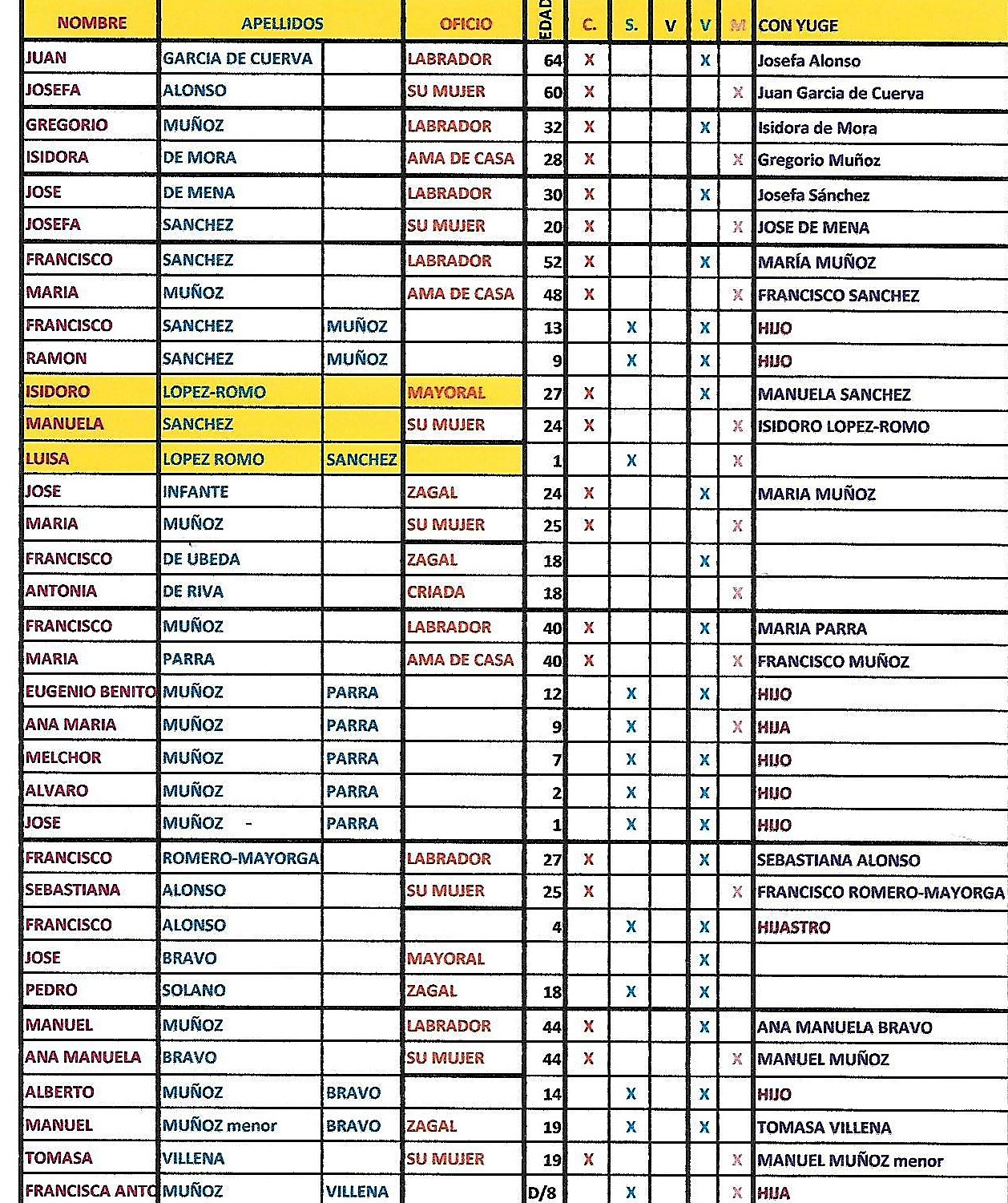 Se indica el nombre del marido o la mujer del titular del registro. Si bien hemos encontrado gran dificultad en el caso de sucesivos matrimonios, pues solo figura el dato del último matrimonio ( 1ª o sucesivas nupcias). Tambien hemos incluido la relación parental con el titular: hijo, hijastro(alnado, antiguamente) ocualquier otro. En cualquier caso a los que figuran en la relacion como hijos si hemos incluido sus dos apellidos: el primero del padre y el primero de la madre.
