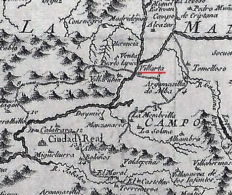 En el borroso mapa de la copia se aprecia debajo de Villarta un número -el 5- que en la leyenda situada al margen del mismo, se lee: Aventura de los molinos de viento. Ese pie de página nº 1 que redactó Juan Antonio Pellicer como explicación a la frase incial del Quijote «..en un lugar de la Mancha…», fué seguida al pie de la letra por otros muchos autores, tales como Agustín Garcia de Arrieta en su edición sobre obras escogidas de Cervantes hecha en Paris en el año 1826; Diego Clemencin en su apasionante y apabullante edición de Don Quijote de la Mancha, publicada en 1894 dice: «No ha faltado quien conjeture que la fila de molinos de la Mota del Cuervo fueron los treinta o cuarenta que quiso designar Cervantes en la presente aventura. Opónses a ello la distancia que media desde la Mota a la Argamasilla, de donde había salido D. Quijote el mismo día, y a Puerto Lápice, a cuya vista llegó a mitad del siguiente; pero esto era corto reparo para Cervantes. El itinerario grabado por la Academia Española señala este sitio entre Argamasilla y Villarta, y no desdice el de Pellicer» [MIGUEL DE CERVANTES. El Ingenioso hidalgo don Quijote de la Mancha. Edición de Diego Clemencin. Edición de 1894]. La edición de Francisco Sales, instructor de Frances y Español en la Universidad de Harvard, editada en Boston en 1836, quien asume totalmente la cita de Pellicer sobre Villarta como el lugar donde ocurrio la aventura de los molinos. En la edición hecha bajo la dirección de Jose Rene Masson, indica en su título «que es en todo conforme a la de la Real Academia Española, hecha en Madrid en 1782« Se editó en Paris en el año 1814 y señala en su portada que Además del Juicio crítico o Análisis del Quijote, el plan cronológico de sus viajes, la vida de Cervantes, y los documentos que la comprueban, comprehendidos en la dicha edición de la Academia, se han añadido las notas crítica sy curiosas al Don Quixote, escritas por el señor Pellicer. En 1847 se edita la edición de Martinez del Romero ilustrada con notas históricas, gramaticales y críticas según las de la Academia Española, sus individuos de número Pellicer, arrieta y Clemencin y además las de F. Sales y Luis Viardot. .. Etc. etc. Por cierto en todos los mapas relacionados con los viajes de Don Quijote figura Villarta como lugar necesrio en esa historia, aunque algunos si se descuidan lo ponen en algun lugar oscuro para que no trastoque la historia.