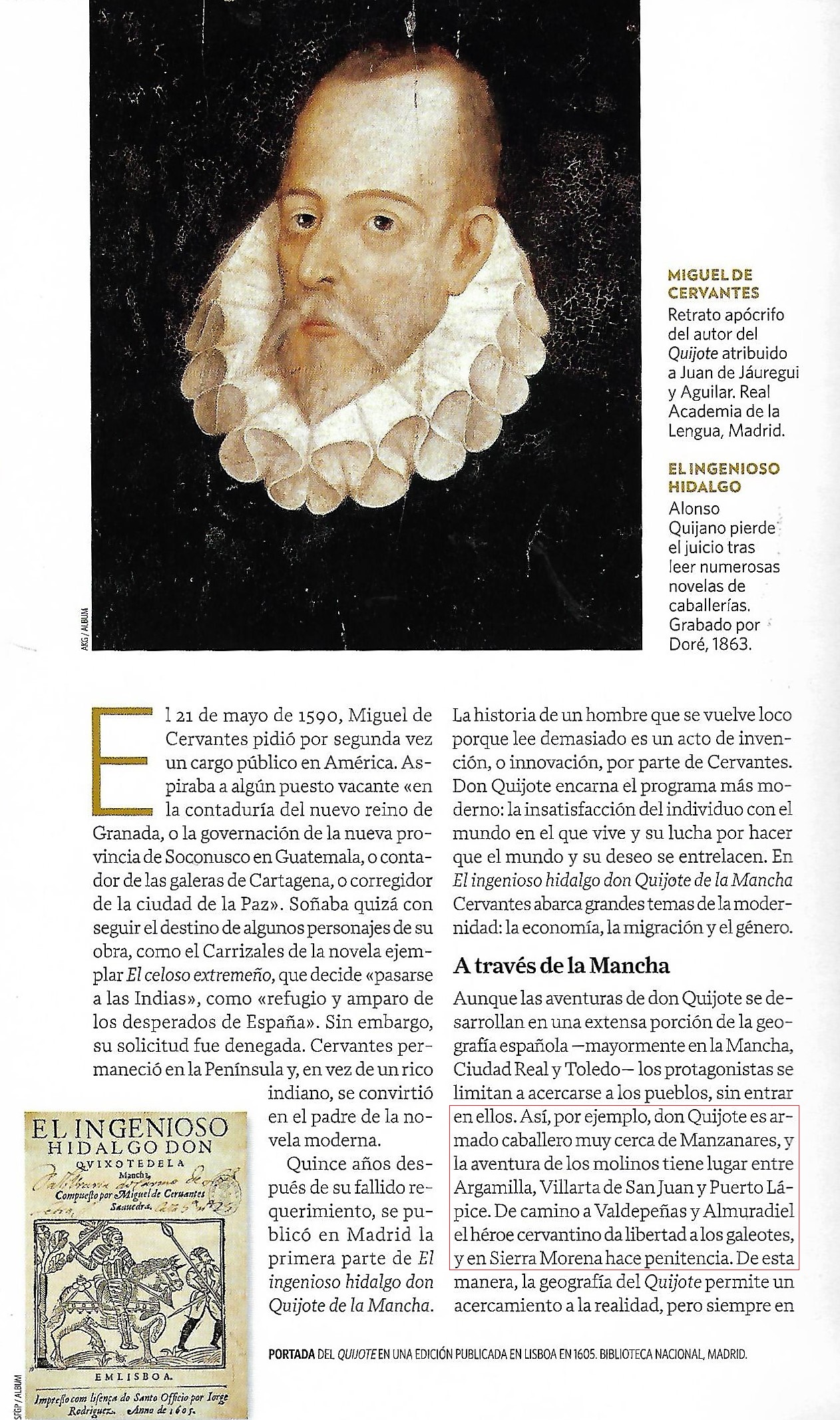 El otro día, (esta expresión tan inconcreta, tan si definir fecha alguna, ni falta que hace, acompañada de la afirmación «por cierto», la aplicamos para garantizar que lo que decimos ocurrió hace poco y que para el que la dice y a quien se la dice tiene importancia), pues eso: -«Por cierto, el otro día», en la revista que me diste de Historia ( El interlocutor es, en este caso, Fernan) venía un artículo titulado «La España de Don Quijote», cuya autora es Goretti González, en el que decía: «Aunque las aventuras de Don Quijote se desarrollan en una extensa porción de la geografía española -mayormente en la Mancha, Ciudad Real y Toledo- los protagonistas se limitan a acercarse a los pueblos, sin entrar en ellos. Así por ejemplo, don Quijote es armado caballero muy cerca de Manzanares, y la aventura de los molinos tiene lugar entre Argamilla (Argamasilla), Villarta de San Juan y Puerto Lápice.» [MARIA GORETTI. Doctora en Filología.IE Universite. La España de Don Quijote. HISTORIA.National Geographic. Nº 212]