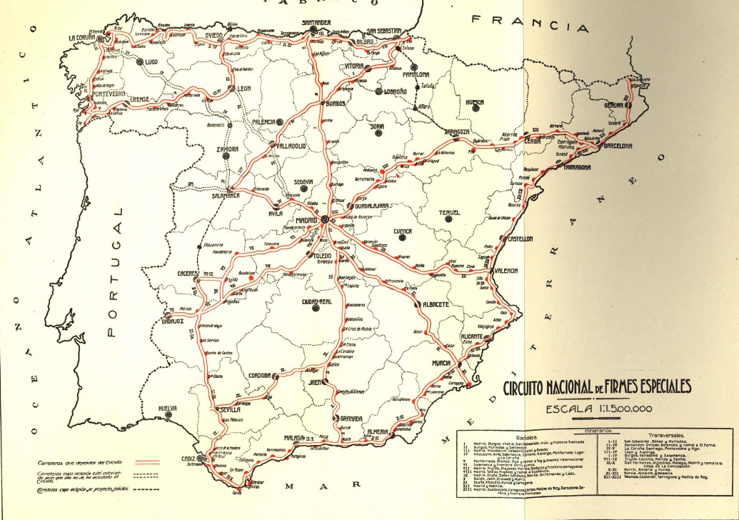 Dentro del Real Decreto-Ley de 8 de febrero de 1926 y en la exposición del mismo se decía » El alto interés nacional de fomentar el turismo, enalteciendo las bellezas naturales y la riqueza artística de España, proporcionando para ello los medios fáciles y gratos de simultanear la seguridad de la circulación ante una esmerada conservación de las carreteras con la grata impresión que supone abandonar la lucha secular con los bachez y con el polvo, enemigos poderosos de la circulación de automóviles, y al propio tiempo la imperiosa necesidad de cambiar el sistema técnico de la construcción de los firmes […] se segregará de la red de carreteras generales los itinerarios principales, y agrupados en circuitos parciales, se formará el Circuito Nacional de Firmes Especiales…. [REAL DECRETO-LEY DE 9 DE FEBRERO DE 1926 POR EL QUE SE CREA EL CIRCUITO NACIONAL DE FIRMES ESPECIALES]