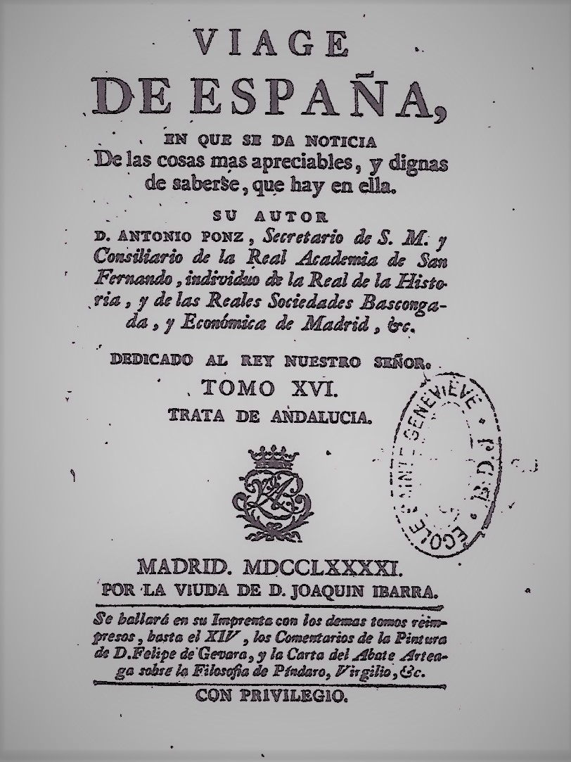 En el año 1791 se publica el Tomo XVI de «Viaje de España, en que se da noticia de las cosas mas apreciables, y dignas de saberse, que hay en ella. Su autor D.Antonio Ponz, Secretario de S.M. y Consiliario de la Real Academia de San Fernando, individuo de la Real de la Historia, y de las Reales Sociedades Bascongadas, y Económica de Madrid, etc. Dedicado al Rey Nuestro Señor. Tomo XVI. Trata de Andalucia. Madrid, 1791.»