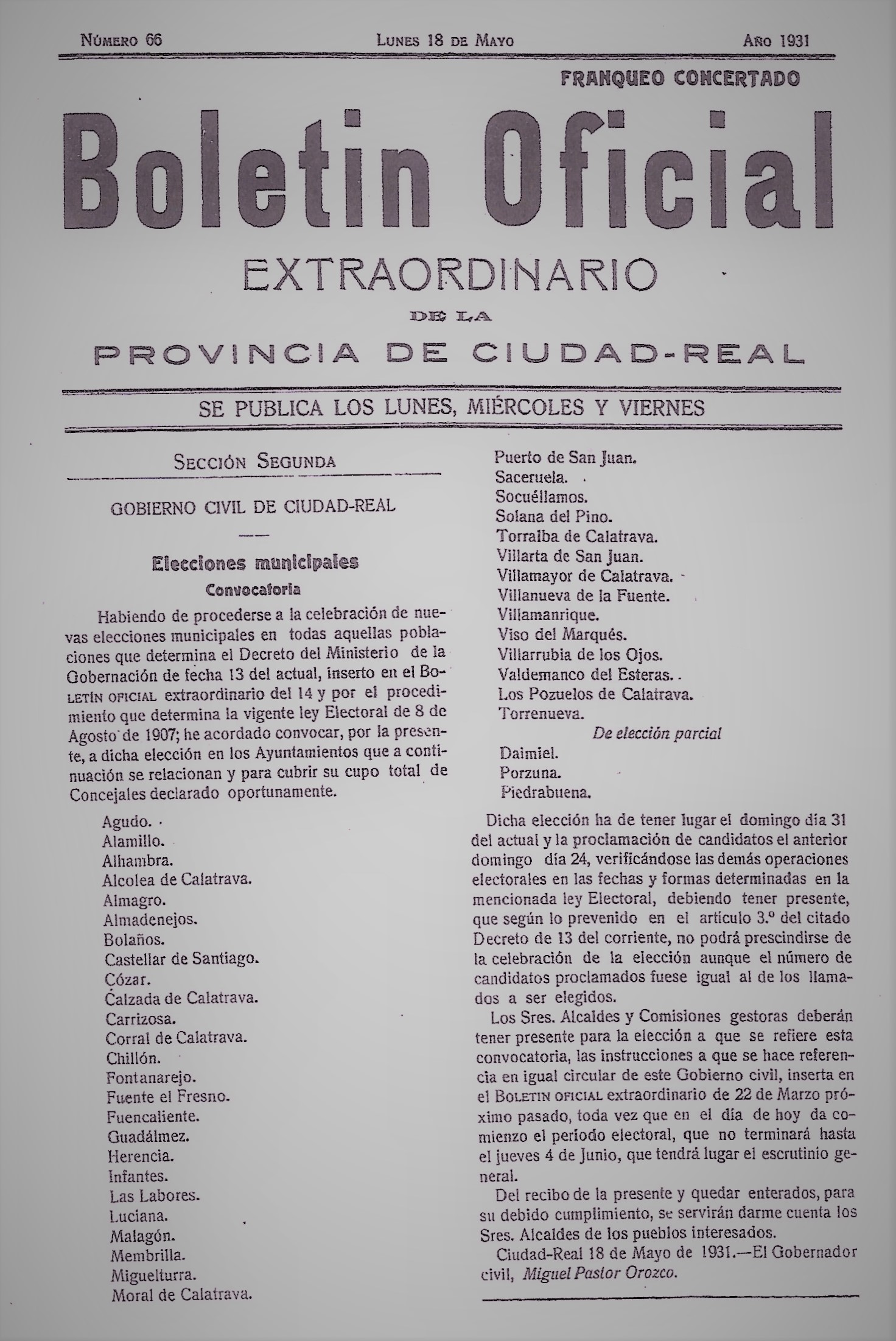 Hay otra fuente oficial a la cual hemos aludir, al menos en esta primera fase y es el Boletín Oficial de la Provincia de Ciudad Real que tenían un recorrido distinto al de la política pero que significaba que la administración debía seguir su curso. En el mes de abril era Gobernador Civil de la Provincia, Don Miguel Angel Rivera, posteriormente fue elegido Miguel Pastor Orozco.