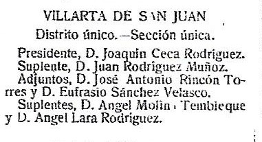 Se publica la convocatoria de elecciones municipales «que ha de tener lugar el domingo día 31 del actual y la proclamación de candidatos el anterior domingo día 23, verificándose las demas operaciones electorales en las fechas y formas determinadas en la ley Electoral de 8 de agosto de 1907..» [ Se firma la citada convocatoria en Ciudad Real el 18 de mayo de 1931 por el Gobernador civil, Miguel Pastor Orozco] Se ratifica por la Junta electoral los mismos miembros de la mesa electoral que en las anteriores elecciones:Villarta de San Juan. Distrito Único: Adjunto propietario, D. José Garrigós Juan; Idem D. Leandro García Vera; Idem suplentes: D. Elicio Moreno Heredia y D. Eugenio Paez Bustos.
