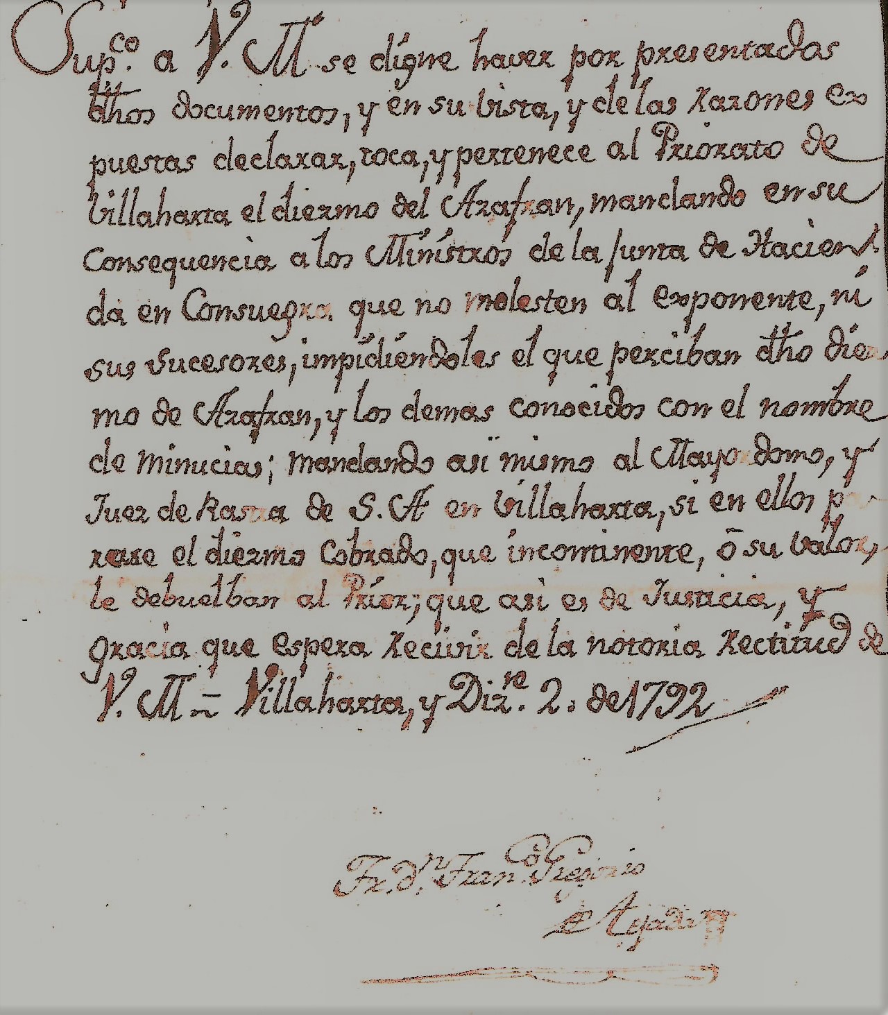 Y hacemos mención de esta petición porque gracias a ella podemos ahora saber que otros tipos de cultivos, además de los ordinarios de aquella epoca ( cereales, uva y aceite) se daban en Villarta en mayor o menor cantidad pero parte consustancial de sus ingresos. En el registro del Archivo General de Palacio se hace exclusiva indicación al Azafran y así en este sentido resume el Contador General del Priorato D. Carlos de Seseña, la petición del Prior, en carta del 13 de diciembre de 1792 al Ilmo. Sr. Don Jeronimo de Mendinueta, Secretario de Cámara de S.A. el Gran Prior: «Remito a Vm la adjunta representación y documentos que la acompañan de Frey Don Francisco Gregorio de Tejada, Prior Párroco de la villa de Villarta en que solicita se declare a su favor pertenecerle y tocarle el diezmo de azafrán (que vm. ha mandado devenguen aquellos vecinosal Señor Infante el Gran Prior) y los demás conocidos con el nombre de minucias [diezmo que como pie de altar se pagaba de las frutas y producciones de poca importancia. En este caso pasaba el diezmo integramente a los priores. a proposito de esta palabras, hemos de recordar la frase popular referido a cosas de poco valor cuando se hablaba diciendo ¡no vamos a discutir ahora por cuatro minucias!.. ] a fin de que enterada esa Junta de Hacienda de dicha representación y documentos me exponga lo que se le ofreciese y pareciere para acordar la providencia que se estime mas oportuna. Dios guarde a Vm muchos años. Madrid13 de diciembre de 1792= Jeronimo de Mendinueta.» [Archivo General de Palacio. Archivo del Infante Don Gabriel. Legajo 293. ].