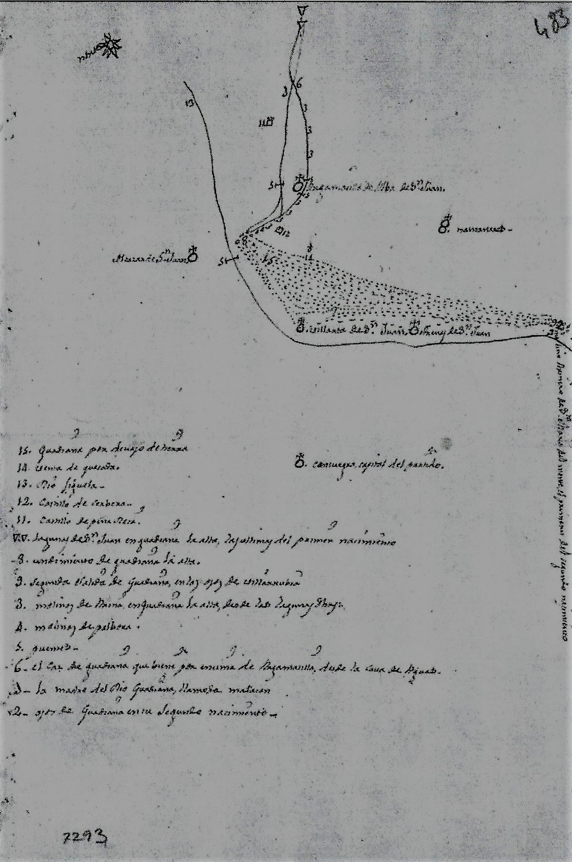 Con Aantonio Carabaña, vecino de esta villa y mi feligrés, tengo respondido a la de vuestra merced, que recibí con fecha de veinte y cinco del mes pasado, y deseando con prontitud complacer a vuestra merced, no obstante que he estado en los sitios que desea saber, para completar el mapa de este partido. He preguntado a pastores y caseros de las quinterias que están en ellos y la razón mas puntual es la que remito a vuestra merced, advitiendo que desde el lugar nuevo (Argamasilla) a Alcázar (y no Alcaraz como aparece en el escrito) hay cuatro leguas; desde Alcázar hasta Villarta, otras cuatro, otras cuatro desde Villarta a Manzanares y de Manzanares a Argamsilla otras cuatro. La venta de Quesada está en medio de Manzanres a Villarta desde el hundimiento de Guadiana a su segunda salida hay siete leguas y todas de monte, excepto por encima de la Venta de Quesada que son tierras de labor. La villa de Arenas está una legua de esta de Villarta, y legua y media o dos del segundo nacimiento de Guadiana. Estas dos villas últimas están situadas al lado del Gigüela; en las que he tomado están pintadas sobre el río Guadiana, que corre por debajo de tierra en la forma que señalan las pintas, hasta su segundo nacimiento; lo acredita la experiencia, pues echando paja en el pozo de la venta de Quesada y en otros de Villarta, han observado los curiosos, que dicha paja, in continenti, se desaparece y va a salir a los ojos del segundo nacimiento, por lo que se ve claramente ser agua de paso, por lo que no sin fundamento me parece que Villarta y Arenas están fundadas sobre Guadiana y al lado de Gigüela. El rio Guadiana se hunde cuatro leguas de esta villa de Villarta y está tres de su segundo nacimiento. La formación de los Ojos de Guadiana en su segundo nacimiento están en la forma que demuestran los ceros, advirtiendo que son tantosque nose pueden contar y están al fin del número 9 y 2. Me alegraré que esta razón esté a la satisfacción de vuestra merced, y si alguna duda o reparo sobre ella se le ofreciese, estimaré no se detenga en preguntarlo// Ruego a Dios guarde a vuestra merced muchos años//Villarta, octubre 10 de 1765// Besa la mano de vuestra merced su mas apreciable servidor.// Frey d. Antonio Folgar y Torres// Dirigida al Señor don Tomás López.