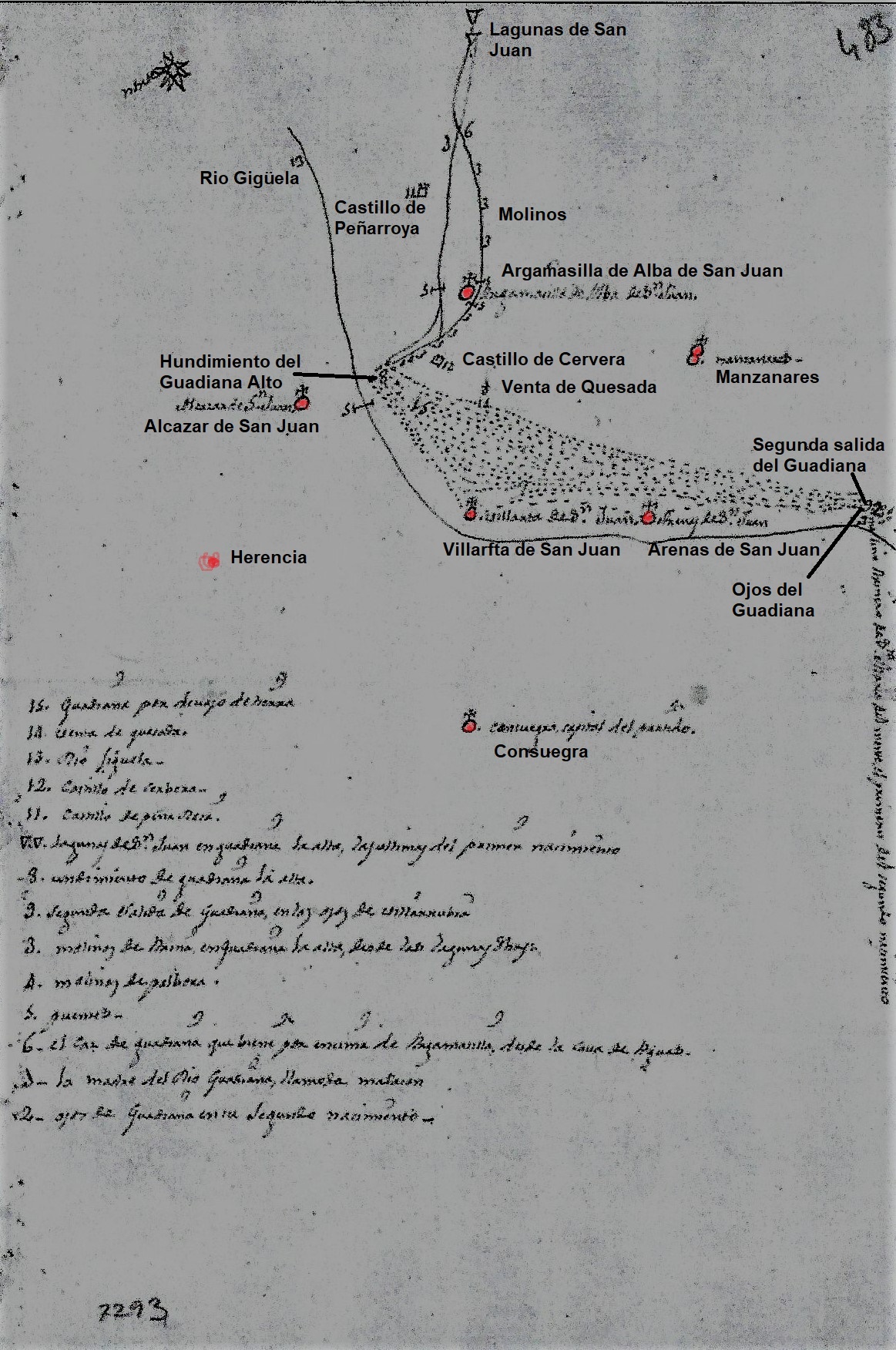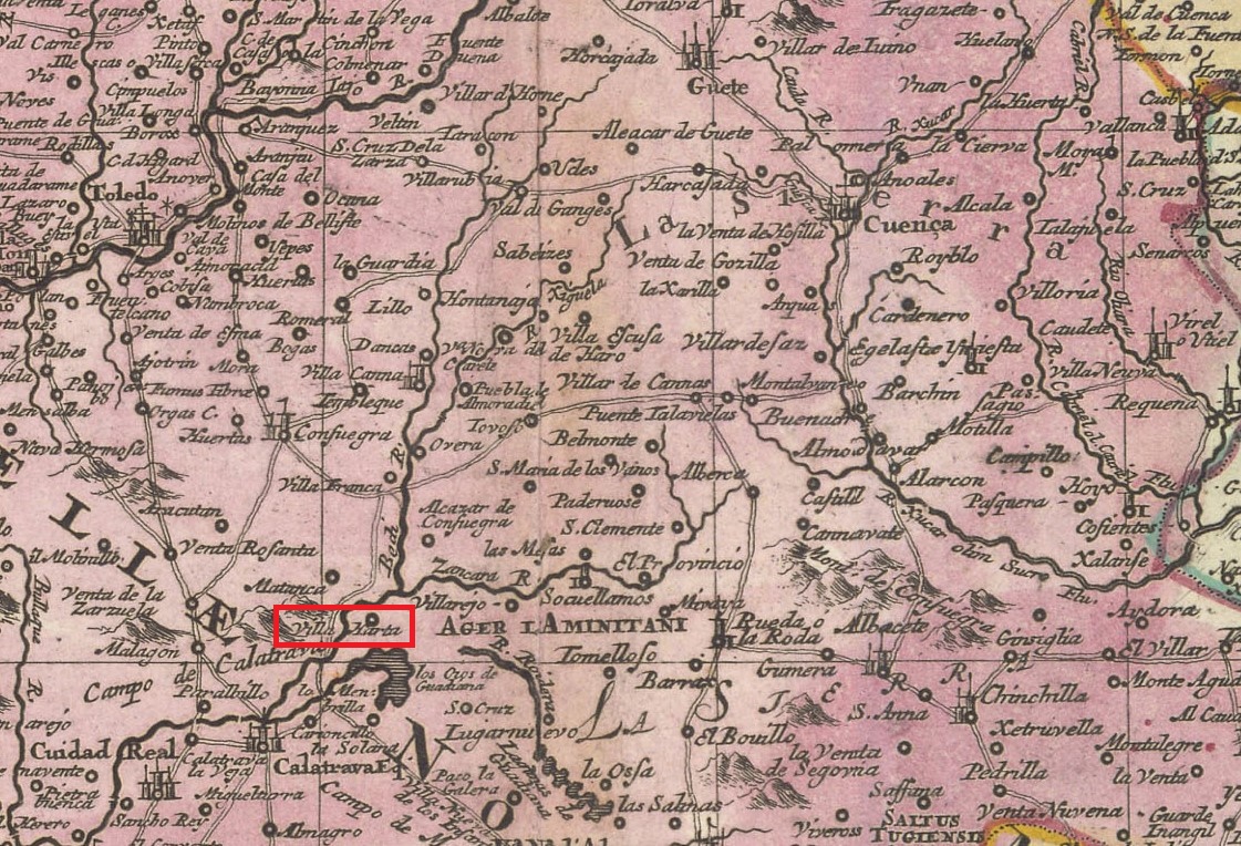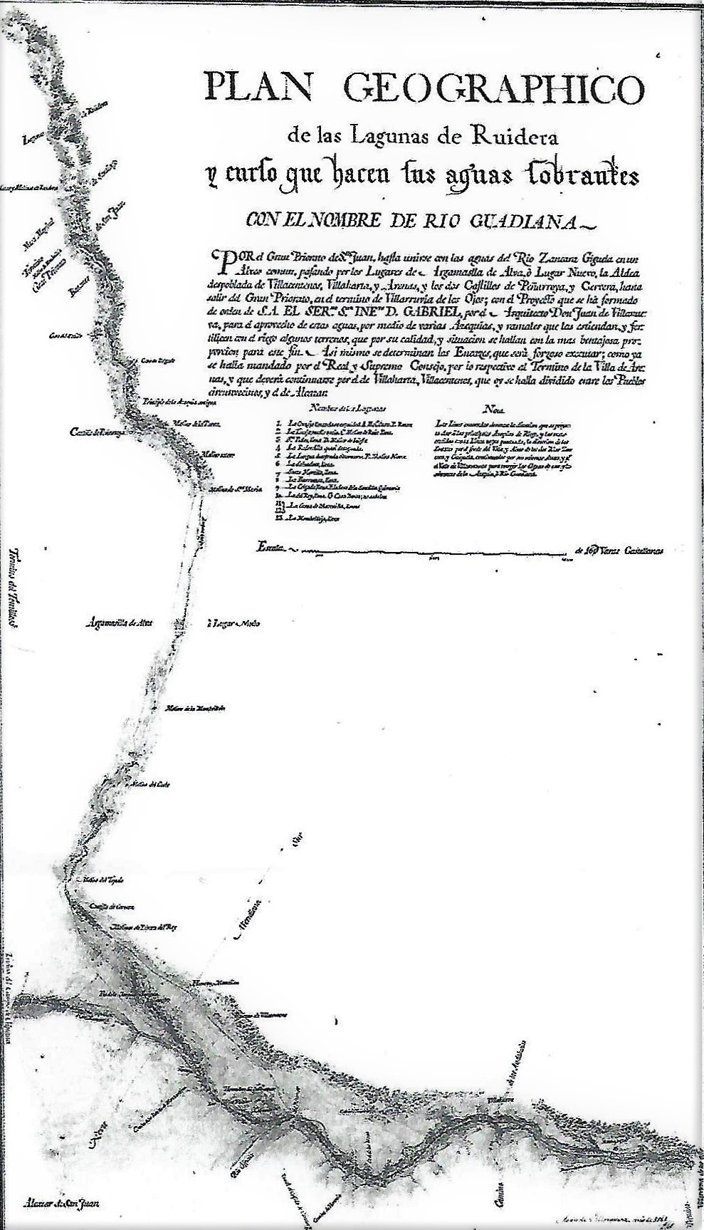 La distancia que marca hasta Villarta ( Villa alta en el mapa) es de siete leguas y marca el recorrido del río Azuer ( Azuel en el mapa que se va a unir al Guadiana cerca de los Ojos del Guadiana marcando en el mapa «sigue asta Portugal» [ El informador es el párroco de la villa].