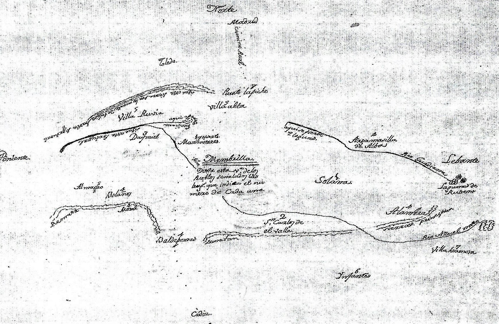 Mapa de Membrilla y alrededores diseñado por Juan García Roson [ Fuente: Libro citado y Manuscrito 7293 de la BNE.)