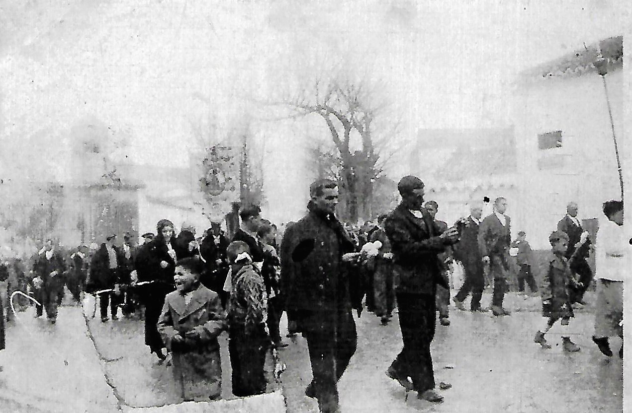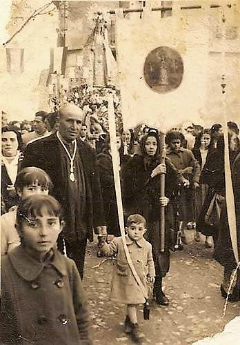 Las fotos que adjunto no llevan orden ni concierto, solo son ráfagas de lo que cualquier villartero, puede pensar en esos dos días importantes de nuestras fiestas, al calor de la hoguera o a lo largo de la procesión. Tristeza, alegría, nervios, sentimientos, cariños que parecían olvidados y vuelven impetuosos. Ventanas entreabiertas, sin nadie tras los cristales o quizás con unas simples rosas atadas a las rejas, como si la persona que allí vivía, hubiera vuelto para decirnos que no se olvida de nosotros, … pasos de personas mayores que quieren seguir a su Virgen, la que le asiste con sus recuerdos en la soledad en que la ausencia de seres queridos le han dejado, lágrimas que para cualquier ajeno parecen no venir a cuento, pero que resumen y encierran en ella una vida de villartero que nunca ha olvidado ni a los suyos ni a su madre. Pueden, que estas y las miles de fotos que entre todos guardamos, nos sirvan para recodor para recordar nuestra historia, nuestra juventud, la esperanza que se desprende de la mirada asombrada de un niño detrás de unos cristales, la mirada de ese niño a la cámara agarrado a la mano de ¿su abuelo?, como diciendole al fotógrafo que la haga bien que esa es una foto para siempre que, incluso, pasará de padres a hijos, sin que al final nadie recuerde quien es pero del que si podrán decir que fué fiel a su tradición desde niño. Esa mujer, a la que sostiene su hija por detras, agarrada fuertemente a los barrotes de la ventana con sus ojos llenos de recuerdos que se dirigen a la Virgen pidiendo…. ¡quien sabe qué! pero seguro que a pesar de todo lo que pueda haber vivido dandole gracias por todo. Cuantas Misis, se habrán aferrado para ver a La Madre…. Esos jóvenes en casa de la Abuela, en su azotea, antes de que la casa de los tres pisos les ocultase la vista total de su pueblo. ¡Cuanta esperanza! ¡Cuánta vida por vivir! De todos ellos, uno encorvado por los años, todavía sale a encontrarse con la Virgen y muchos días, aún, se llega a la nueva iglesia para contarle a la Virgen, su día a día, sin quizás pedir nada, sino recordando y recordando. En una de las fotos, quizás del año 1934, hemos recuadrado en azul, como era la antiquísima ermita de la Virgen de la Paz que, como dice la historia de nuestro pueblo, estaba a las afueras del pueblo.
