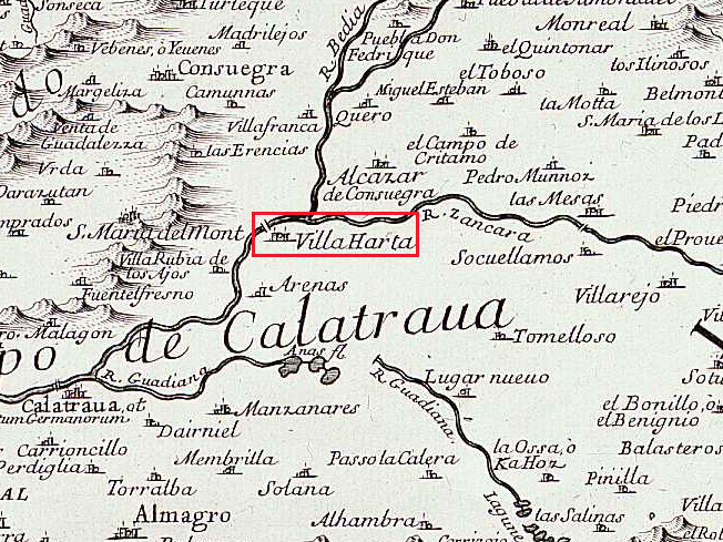 Mapa de Giacomo Cantelli da Vignola de 1696 (En el mapa, el autor señala perfectamente la existencia del puente, si bien la ubicación de Herencia es confundida con el lugar de las Erencias de la Provincia de Toledo, sin marcarlo. La ubicación de Villa Harta ( sobre el mapa) es la más correcta de la mayoría de los poblados , debido a su situación sobre el rio Záncara-Gigüela y el puente sobre el mismo.)