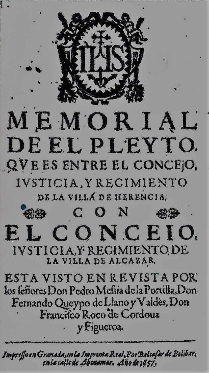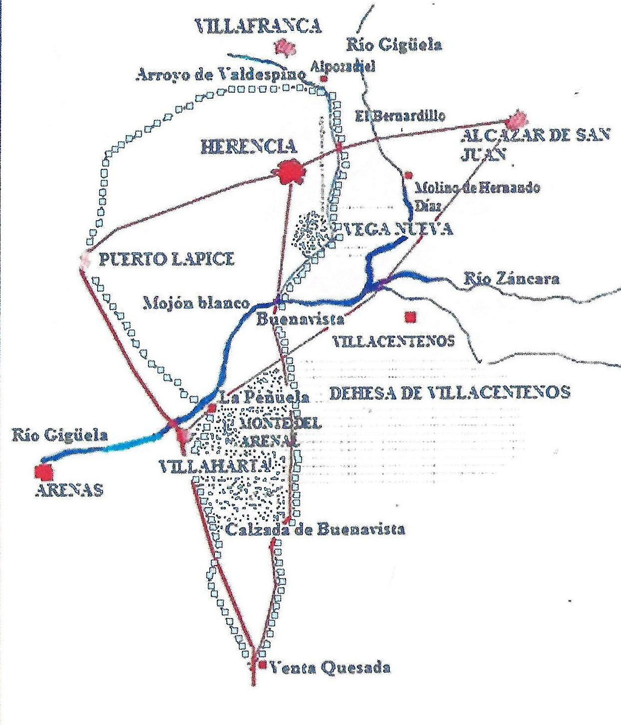 Mucho se ha hablado de la antigua villa Centinilla o de los Centenos y por tanto de Villacentenos, aunque de ella partieran los primeros repobladores que se acogieron a la Carta puebla de Herencia, cuando la antedicha Villacentenos comenzó a despoblarse. Lo que si hay que resaltar es el sentimiento heredado durante muchos siglos, de pertenencia o relación entre Herencia y Villacentenos, aunque esta sea compartida por varias villas. Ya en su momento los herencianos Ruy Martinez Barregón y Martin Gomez Pabon en la respuesta a la pregunta 45 de las Relaciones de Felipe II (1575), decían: “.. hay otro termino de común aprovechamiento que se dice Villacentenos con Alcazar y Arenas y Villaharta y es todo de labor y pastos..” [VIÑAS, CARMELO y PAZ, RAMON.- Relaciones de los pueblos de España ordenadas por Felipe II]. Sin embargo, en esos mismos años en que se dan las respuestas, es cuando los pleitos entre las villas del Priorato, que se habían subsanado hasta entonces con sentencias de los Priores de San Juan, van a pasar a judicializarse mediante apelaciones al Real Consejo de Castilla, a la Real Chancilleria de Granada o a la Sala de las Mil Quinientas [La sala de las Mil y Quinientas doblas era la tercera sala de Justicia del Consejo y se encargaba de los asuntos de mayor cuantía y de los negocios que requeríoan brevedad]. Es evidente que al ser los alcaldes ordinarios de las villas los administradores de justicia en primera instancia, «su justicia«, su autoridad tenía como límite el ámbito de su jurisdicción territorial; al mismo tiempo, el ejercicio de su cargo como alcalde le imponía lograr el bienestar de sus conciudadanos y la defensa de los mismos frente a otras jurisdicciones. Las infracciones, por tanto, de las ordenanzas vigentes en cada villa, en especial las ordenanzas de montes y pastos, van a originar numerosas denuncias sobre vecinos de otras localidades que pastorean, cortan o talan en dehesas de otro municipio o que el municipio denunciante considera como de su propia jurisdicción. Por tanto la dehesa de Villacentenos ( de aprovechamiento común, según unas localidades, o jurisdicción única, según otras) va a ser origen de frecuentes pleitos entre las villas de Alcázar, Herencia y «Arenas-Villarta»[ Hacemos la indicación Arenas-Villarta porque hasta mediados del siglo XVII, Villarta es una aldea, dependiente en primera instancia de Arenas y no disponía de términos con jurisdicción propia hasta que consigue el título de villa en 1648, pasando a no depender en primera instancia de la villa de Arenas] casi siempre recurridos a otras instancias judiciales superiores. Gran parte de estas sentencias y apelaciones, ocurridas hasta poco antes de la aprobación de la concordia están citadas y recogidas en el memorial del pleito entre Herencia y Alcázar visto en revista sobre confirmar o revocar sentencia de vista pronunciada en ocho de Enero de 650 [REAL CHANCILLERIA DE GRANADA.Memorial de el pleito que es entre el conceio e iusticia y regimiento de la Villa de Herencia con el conceio e iusticia e regimiento de la villa de Alcazar; está visto en revista por los señores Don Pedro Mexia de la Portilla, Don Fernando Queypo de Llano y Valdés, Don Francisco Roco de Cordoba y Figueroa. Granada 1657] En cualquier caso el memorial recogen las alegaciones presentadas por cada una de las villas inmersas en los pleitos y por tanto los argumentos que en ella aparecen están utilizados buscando en ellos una apoyatura para sus intereses e incluso en algunos de ellos utilizando adscripciones inventadas con tal de hacer mas fuerza en sus alegatos. La utilización de escrituras o documentos no siempre originales van a suponer un problema mas a la hora del establecimiento de los términos de esta zona que van a tener siempre como nexo común la dehesa de Villacentenos (con término propio) y que se van a prolongar hasta casi finales del siglo XVIII como puede comprobarse en el expediente de 1769 “Condiciones para el ajuste de concordia que se trata de hacer entre esta villa [Alcázar] y la de Herencia, para los pleitos por los términos de Veganueva y dehesa de Villacentenos”, recogido por José Fernando SÁNCHEZ BÓDALO en el catálogo del Archivo Histórico Nubicipal de Alcázar de San Juan.