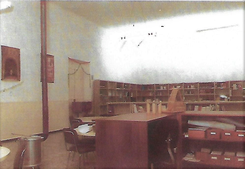 La primera ubicación de la Biblioteca (una aula de las Escuelas viejas) y su emotiva estufa en el centro (Archivo personal)