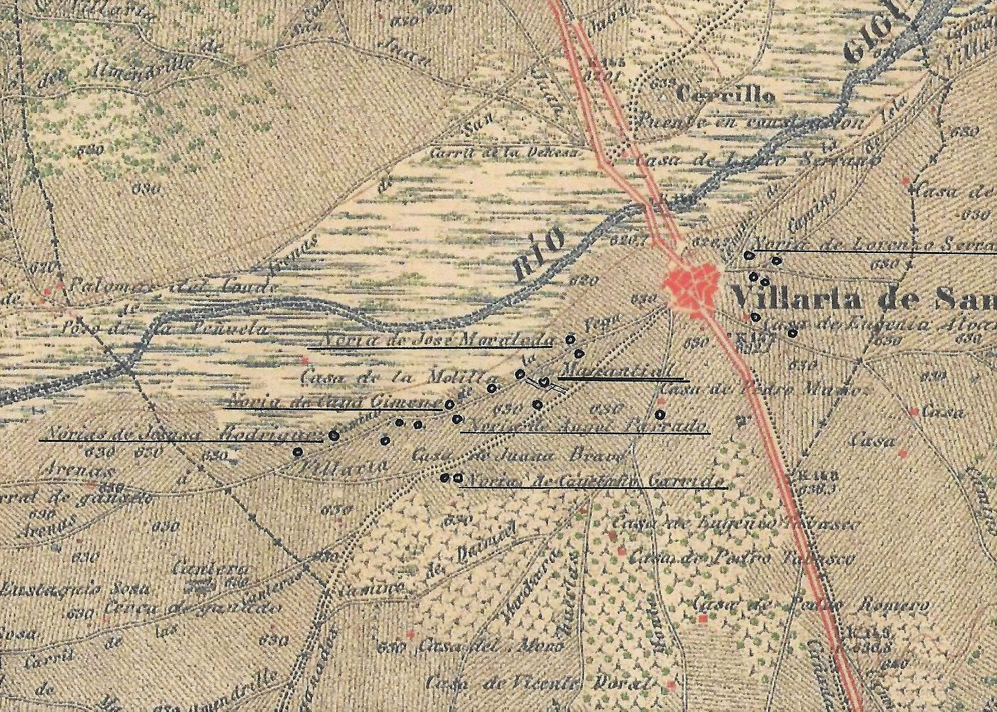 Nº 1. Noria de Jesusa Rodriguez; Nº 2 Noria de Jesusa Rodriguez; Nº3 Noria de Viuda de Vicente Muñoz; Nº 4 Noria de Tomás Rincón; Nº 5 Noria de Juana Bravo; Nº6 Noria de Caya Jiménez; Nº 7 Noria de Angel Parrado; Nº 8 Noria de Viuda de José Muñoz; Nº 9 Noria de Manuel Muñoz; Nº 10 Noria de Antonio Muñoz; Nº 11 Noria de José Moraleda; Nº 12 Noria de Alfonso Serrano; Nº 13 Noria de Eusebio Doral; Nº 14 Noria de Juana Bravo; Nº 15 Noria de Manuela Muñoz; Nº 16 Noria de Cayetano Garrido; Nº 17 Noria de Sebastian Muñoz; Nº 18 Noria de Lorenzo Serrano; Nº 19 Noria de Cayetano Sánchez; Nº 20 Noria de Domingo Serrano; Nº 21 Noria de Isaac Serrano; Nº 22 Noria de Eugenia Alvarez y Nº 23 Noria de Segundo Meco (Segundillo). Todos estos datos dieron lugar a la publicación de la Hoja 738 que en su pie recoge la sigueinte nota: «Formado y publicado por el Instituto Geográfico y Estadístico bajo la dirección del Excmo Señor Mariscal de Campo Don Carlos Ibañez e Ibañez de Ibero, Director General. Año 1886».