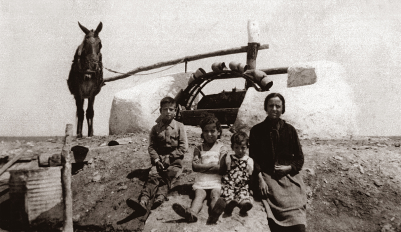 Paz Molina, tirando de su borriquillo con sus «aguaeras» de esparto. (Fuente: Colección de fotografias de Miguel Angel Cándenas)