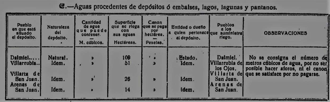 Uno de los aspectos que más preocupaba, aparentemente, a los redactores de este proyecto o memoria era el coste del regadío y en este sentido se ve en el anterior impreso los datos en los que se hace hincapie, como era el tipo de cultivo que es de regadío, la cantidad de agua ( en metros cúbicos) que se necesitan, precio medio del importe que se paga o cuesta por hectárea, etc. El gráfico anterior al que aludimos solo cita con este tipo de regadío a los pueblos ribereños de las tablas de Damiel y de las de Villarta-Arenas, es decir: Daimiel, Villarrubia, Villarta de San Juan y Arenas de San Juan, indicando como dueño al estado, aunque el verdadero titular como terrenos de propios eran los respectivos ayuntamientos ( en el proceso de desamortización no lograron venderse siguiendo por tanto de titularidad municipal). En Villarta se supone una superficie de 26 ha. equivalentes, aproximadamente, a 39 fanegas de tierra, a la que habría que restar la superficie que cubrían las zanjas.