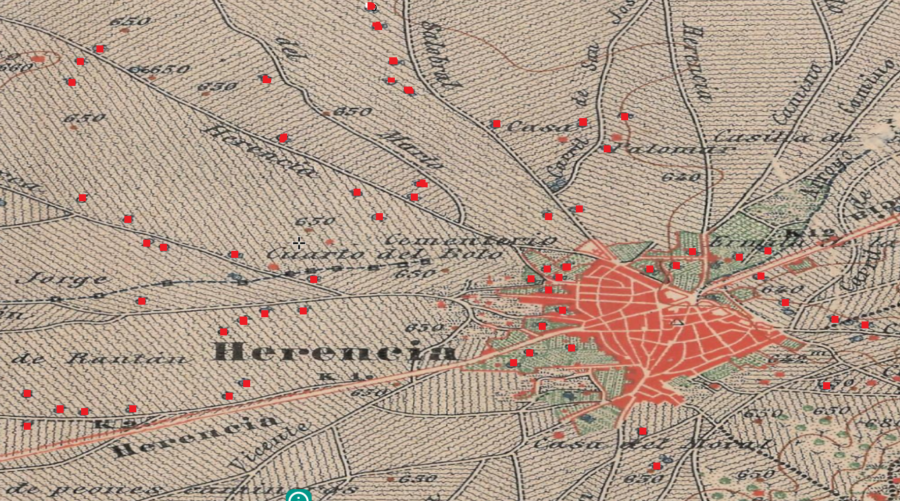 Por lo que se decía en el informe de ROLDÁN CAÑAS y MORENO PÉREZ en un ejemplo más de que sí había datos suficientes para proceder a una estadística de norias, adjuntamos un fragmento del mapa del Instituto Geográfico y Estadístico de la misma fecha en la que vemos el gran número de pozos de norias existentes en el municipio cercano de Herencia, en el que además la zona que rodea al municipio por occidente está ocupado continuamente por huertas.