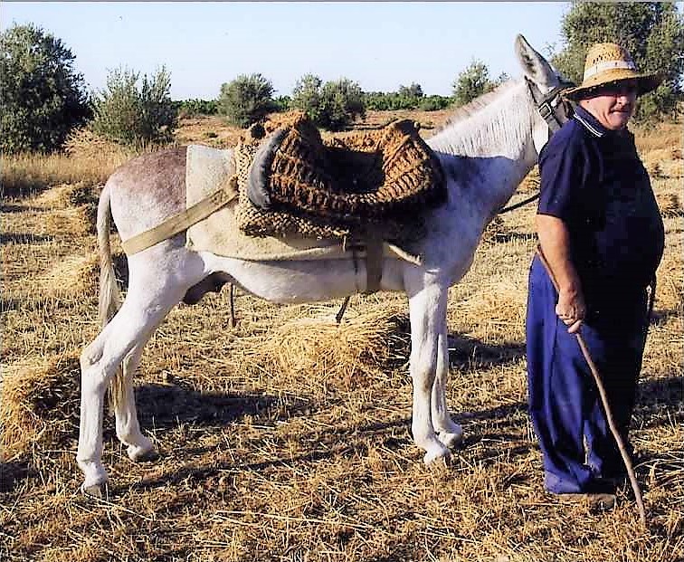 Las norias como artilugio se llamaban «norias de sangre» porque eran accionadas por animales, mulas o burros. Más frecuentemente por estos últimos mas asequibles, económicamente, para los que se encargaban del cultivo o eran dueños de las huertas. Con mi padre («Pernales») iba a su huertecilla, donde estaba el imponente árbol de perillas sanjuanistas, que algunos recuerdan. Íbamos en un borriquillo, como el de Pacito, al que llamábamos «Cigarrones». Al final, cuando las aguas empezaron a bajar, «Cigarrones» (no recuerdo qué sería de él) fué sustituido por un motorcillo. Se aparejaba con unas «aguaeras«, que era un aparejo hecho de esparto. ( Su nombre real era el de aguaderas, es decir, aparejo para llevar el agua en cántaros, con cuatro compartimentos dos a cada lado. Los hortelanos, sobre todo, llevaban las aguaeras con dos compartimentos para llenarlos, a la vuelta, con los productos de la huerta; tomates, pepinos, pimientos etc.).