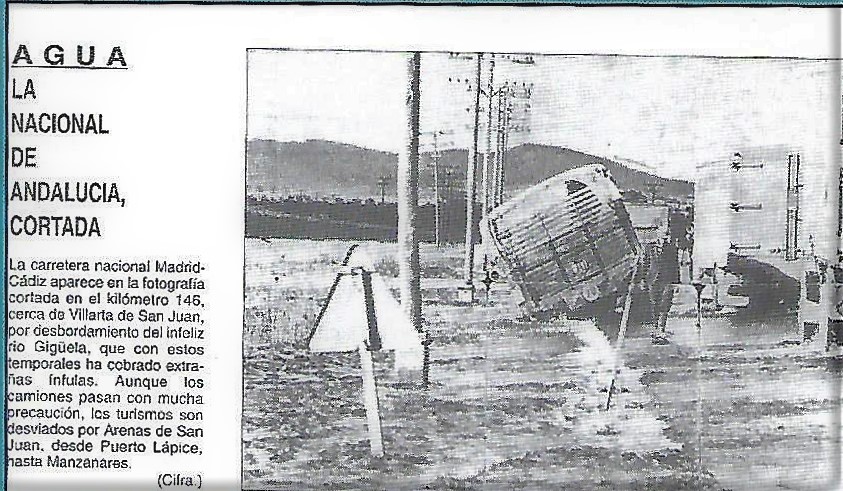En algunos periódicos saltaban noticias como esta de la Agencia Cifra, en el año 1973: «AGUA. LA NACIONAL DE ANDALUCIA CORTADA. En el kilómetro 146 de la carretera de Andalucia, cerca de Villarta de San Juan, por desbordamiento del ¡infeliz río Giguela, que con estos temporales ha cobrado extraordinarias ínfulas! (las exclamaciones son mias)«.