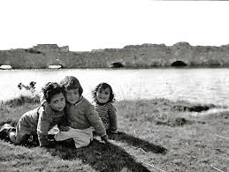 Familia de José Pérez, el practicante, jugando frente al puente ya con alto nivel de deterioro ( el rio si llevaba agua todavía (Fuente: Archivo Personal de la familia Pérez)
