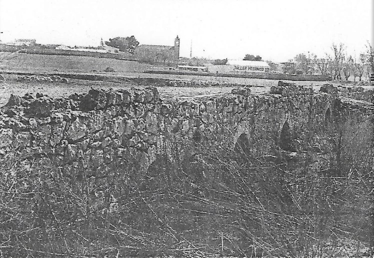 La anterior fotografía tiene un interés especial ya que la parte de muralla de la izquierda, construida a «soga y tizón» pueda corresponderse con la cita que se hace del cerrillo de la cruz (aunque no existe noticia ni oral ni escrita de la existencia de la citada cruz). En la construcción » a soga y tizón», los sillares se van alternando: unos por su lado más largo (soga) y otros por el más corto (tizón). En la fotografía se ven solamente cuatro hiladas, practicamente desde la cimentación hasta donde empieza la acitara o pretil del puente: la parte mas ancha es la denominada a soga, se corresponde con la primera hilada, en la segunda hilada, «a tizón» , las piedras, -sin desbastar-, están colocadas por la parte mas estrecha; la tercera hilada esta puesta a «soga» y la última a tizón.