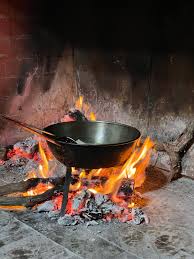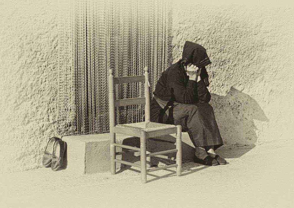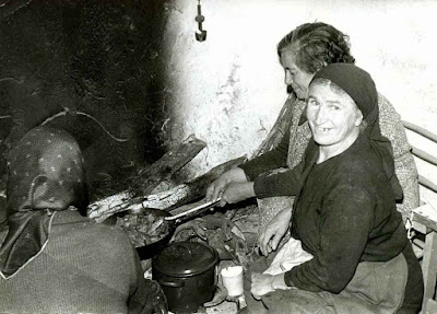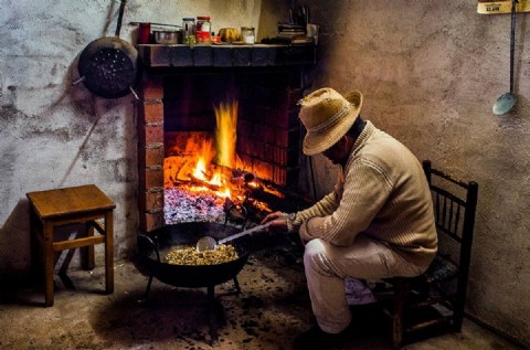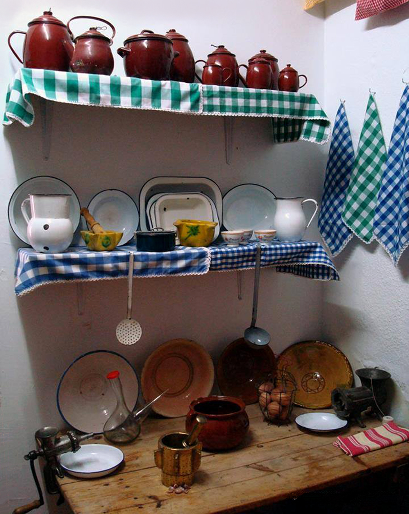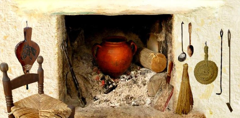 Siempre que he hablado de mi abuela la he situado en el «poyete»; un lugar de descanso y distracción para ella y un recuerdo para mi, a pesar de los años que van pasando. Pero ella, al igual que otras muchas mujeres, hacía muchos años que no tenía domingos. Hacía muchos años que recordaba, con el alma en vilo pensando en ese novio que había tenido que ir a la guerra de Cuba. Las guerras, las enfermedades,… Pero había un lugar en la casa, que se había convertido en refugio( me imagino que al igual que para ella sería igual para otras muchas abuelas), un refugio para llorar en silencio pero que era su dominio, su centro, en el que ella se desenvolvía, día a día, organizando, echando la lumbre, haciendo la comida,… sin que nadie mas de la familia osase intervenir en su trabajo. Yo oía siempre decir a mi madre que la abuela disfrutaba en «sus dominios» pero era algo más; era una continuación de su vida, dedicada a la misma tarea. Pero ¿cuales y como eran esos dominios? Me estoy refiriendo a la cocina. Desgraciadamente los tiempos eran los que eran y no será muy fácil encontrar fotos de esas cocinas entrañables que, dentro de su pobreza, rezumaban cariño, dedicación y querencia. Eran su vida. No se había levantado mucho después que la gente del campo. Aunque tenía medido el tiempo de su trabajo, después de tantos días, después de tantos años, le gustaba levantarse tranquila. No se cual sería su desayuno. Era de muy poco comer. Asi que con su bata oscura y su mandil de cuadros, se dirigía al hogar de la chimenea a retirar la ceniza que se había hecho del día anterior y la que había detrás de la plancha de hierro que se apoyaba en el fondo de la chimenea y que durante el día tapaba la ceniza que se iba haciendo. Salía al pequeño patiejo, al fondo del cual una destartalada puerta comunicaba con un pequeño corralillo medio cubierto con una tená (cuatro palos que soportaban otros más pequeños a modo de vigas, donde se había ido colocando las gavillas) y con una maña increible que no con fuerza, tiraba de una gavilla y la partía por mitad. La llevaba al fuego y con unos papeles puestos entre medias a los que pegaba fuego prendía la gavilla con el apoyo de un viejo fuelle que todavía cumplia su función. Detrás de ese fuego tapando un poco la plancha de hierro echaba un buen puñado de paja para que no se pasase el fuego enseguida. La verdad es que la cocina estaba llena de puertas: la que daba al sótano, con las paredes recomidas por la arena, la del patiejo, cristalera que era el único lugar por donde podía entrar luz y la que comunicaba con el vestíbulo y el resto de la casa. Por la mañana, sobre todo, la puerta del patio estaba siempre medio abierta por muchas razones, porque no se llenase la cocina de humo y al mismo tiempo tuviese el fuego el suficiente tiro. Pero además es que en el patiejo, con algunas rosal y algún membrillo, estaba el pozo del agua. No era muy profundo aunque de vez en cuando había que hacerle alguna «entrá» para retirar la arena del fondo. El agua no era de muy buena calidad, como casi ninguna del pueblo pero no había otra. Y la tercera razón es que había que limpiar los orinales de toda la noche. A veces se compraba alguna garrafa de agua del Encinar que traía Gaspar en su carro con su cuba. Este agua si era de muy buena calidad pero estar todos los días pendientes de ella era demasiado desacarreo. Frente a la chimenea había un fregadero de cemento al que poco a poco se le iban viendo los alamabres del entramado y debajo de él, tapado con unas cortinillas se guardaban los escasos elementos de limpieza, entre ellos como no un pedazo de moleña. Limpiaba con parsimonia todos los cacharros y los dejaba escurrir, antes de secarlos. Mientras tanto el fuego de las gavillas había ido haciendo brasas y era el momento de echar trozos de cepa que se consumían mas despacio y que además dejaban apoyo para los pucheros que, además, se sujetaban con un tranco semicircular de hierro y para las sartenes de tres patas. Al lado derecho de la cocina había una pequeña alacena en la que se guardaban las tazas y «vedriao» de uso diario y algunos alimentos. pan para picatostes ( no todos los días), alguno dulce ocasional, aceite, vinagre y poco más. Una mesa baja tocinera cubierta con un mantel servía para el almuerzo en los grandes tazones blancos de entonces (todos iguales) y encima de ella unos vasares donde poner los pucheros y ollas. Las sartenes, trébedes y demas «apichusques» de la cocina se apoyaban junto a las paredes de la chimenea o colgaban en clavos que tenían las paredes: tenazas, badil algún gancho el omnipresente fuelle y la eterna escoba para ir remetiendo las cenizas hacia dentro y no se «esparramasen» por toda la cocina. Una silla baja de anea junto al fuego guardaba el lugar donde se sentaba mi abuela. En la pared de la cocina que daba al vestibulo había una banca con un colchon vestido con telas como las de estameña manchega y junto una mesa que durante el día, hasta la hora de comer, era el lugar donde se iban depositando todos los cacharros del día a día. Después de comer, limpia la cocina, la cocina quedaba en silencio y acomodada para una tranquila siesta para el hombre de la casa.