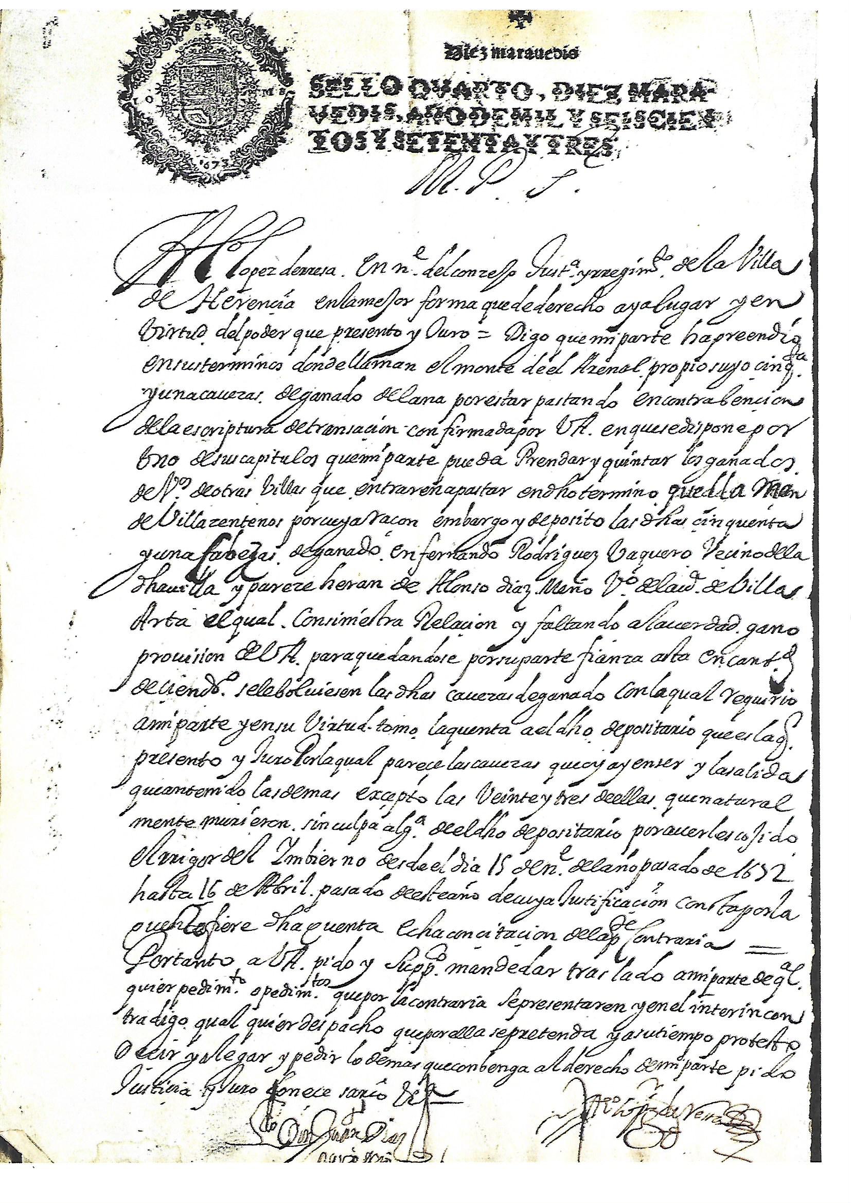 Alonso Lopez de Resa . En nombre del Concejo Justicia y Corregimiento de la Villa de Herencia en la mejor forma que de derecho haya lugar y en virtud del poder que presento y juro= Digo que mi parte apreendió en su término donde llaman el monte del Arenal propio suyo, cincuenta y una cabeza de ganado lanar por estar pastando en contravención de la escritura de trasanción confirmada por V.A. en que se dispone por una de sus capitulos que mi parte pueda prendar [quedarse con algo] y quintar [la quinta parte del total] los ganados de propios de otras villas que entraren a pastar en dicho término que llaman Villacentenos por cuya razón embargó y depositó las dichas cincuenta y una ovejas de ganado en Fernando Rodriguez Vaquero, vecino de la dicha villa y parece que eran de Alonso Diaz Meño, vecino de la villa de Villa Arta, el cual con siniestra relación y faltando a la verdad ganó provisión de V.A. para quedandose por su parte fianza hasta en cantidad diciendo se le devolviesen las dichas cabezas de ganado con la cual requirió a mi parte y en su virtud tomó la cuenta al dicho depositario que es la que presentó y juró por la cual parece las cabezas que hoy hay en ser y la salida que han tenido las demas excepto las veintitres de ellas que naturalmente murieron sin culpa alguna de el dicho depositario por haberles cogido el rigor del invierno desde el día 15 de enero del año pasado de 1652 hasta el 16 de abril pasado de este año de cuya justificación consta por la ….. dicha cuenta hecha con citación de la parte contraria = Por tanto a V.A. pido y suplico mande dar traslado a mi parte de cualquier pedimento o pedimentos que por la parte contraria se presentaren y en el interin contradigo cualquier despacho que por ella se pretenda y a su tiempo protesto decir y alegar y pedir lo demas que convenga al derecho de mi parte, pido y Juro… Firma Alonso López de Resa.