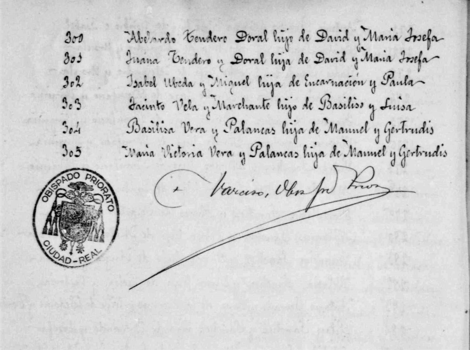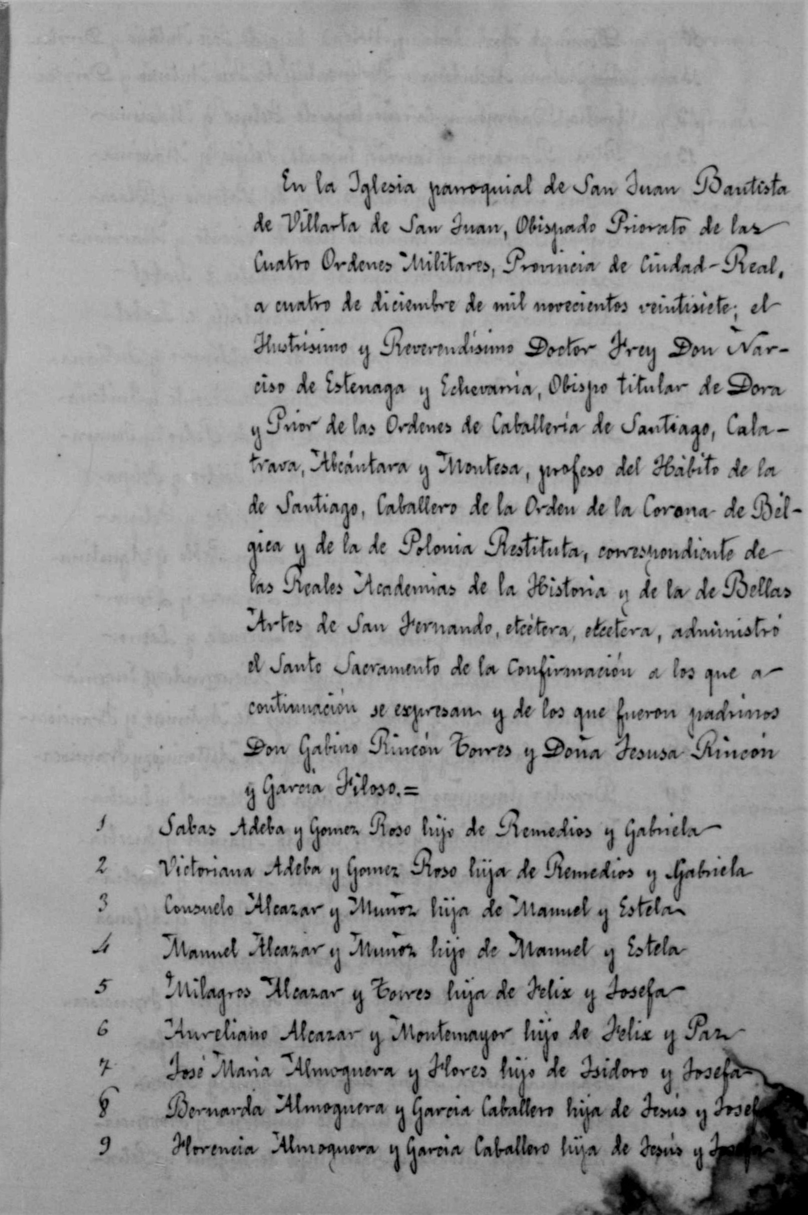 Relación de personas confirmadas el 4 de diciembre de 1927 en la Iglesia Parroquial de San Juan Bautista de Villarta de San Juan por Don Narciso de Estenaga y Echevarría, obispo titular de Dora y Prior de las Ordenes Militares (En la presentación de en la actualidad ya Beato Narciso de Estenaga y Echevarría, figura un curriculum personal de títulos). Los padrinos de Confirmación fueron Don Gabino Rincón Torres y Dª Jesusa Rincón Garcia-Filoso. [La fuente de estos datos es: «España, registros parroquiales y diocesanos, 1307-1985. //https//familysearch.org.]
