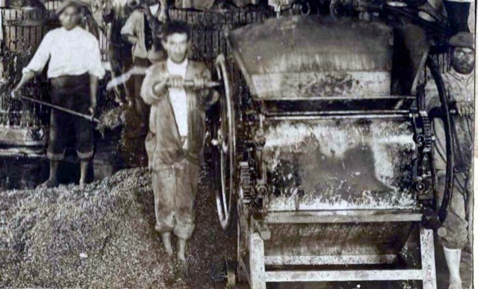 Fragmento ampliado de la anterior fotografía en la que se aprecia el funcionamiento manual de una «moledora» accionada por dos «pisadores», mientras otro amontona la «casca» para cargar la prensa, también manual.