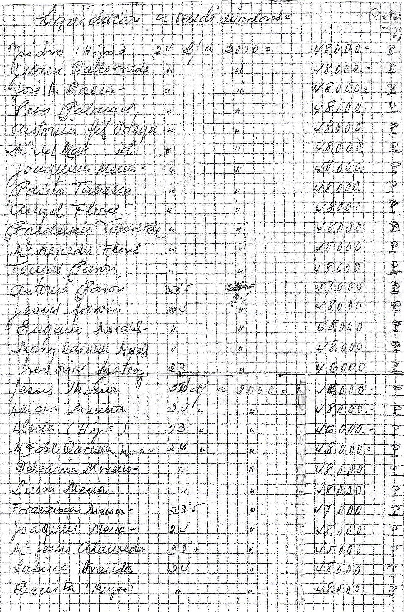 Y el primer viaje de vendimias era ir a por las cuadrillas. Las cuadrillas que no eran del pueblo, tenían por aposentos cualquier porche o habitación desvencijada, en alguno de los corrales con mínimo espacio para dejar las secas rellenas de paja para dormir y los hatos de cada uno. Es evidente que no reunían condiciones mínimas ni de habitabilidad ni higiene. Como serían esas estancias, que las cuadrillas se alegraban cuando la viña estaba lejos de pueblo y tenían que estar de «quintería»; al menos, aunque no reunían tampoco condiciones, estaban bajo techado. A propósito de cuadrillas, conservo un cuaderno de mi suegro, Joaquín Camacho, en el que, anotaba la liquidación de los vendimiadores. [ Eran todos de Villarta y en ese año el sueldo era de 2000 pesetas (12.02€) al día, sin que hubiera diferencia alguna de sueldo entre hombres y mujeres. Para hacernos una pequeñísima idea de lo que suponía este sueldo podemos señalar que un litro de leche fresca valía 53 pesetas (0.31 €), un análisis ( para los que no tenían seguridad social valía 26 pesetas (0.15 €) y un paquete de fortuna valía 220 ptas (1.32 €) ] :